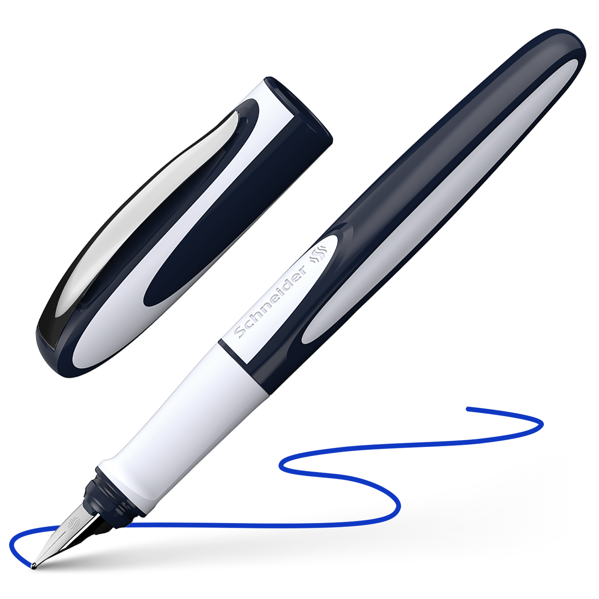 Penna stilografica dal design futuristico che unisce modernità, lifestyle e sportività. Con impugnatura ergonomica gommata e pennino in acciaio inox di alta qualità con punta in iridio. Cartucce d'inchiostro standard blu reale cancellabile. La versione \"L\" è dotata di pennino e impugnatura per mancini