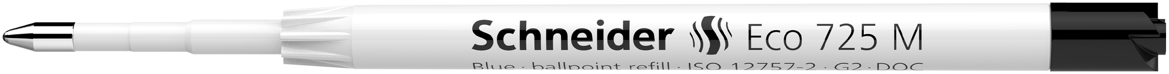 Grote navulling in ISO-formaat G2, de houder bestaat voor 94% uit gerecycled plastic, documentecht volgens ISO 12757-2, lijnbeedte Medium (M). Schrijfkleur zwart. Gecertificeerd met het milieukeurmerk \"Blauwe Engel\". Geschikt als navulling voor de Reco balpen en alle Schneider balpennen met Plug + Play-systeem, evenals vele andere merken. Dankzij de aangename lichte en constante inktstroom zorgt Eco 725 voor schoon en comfortabel schrijven. De slijtvaste roestvrijstalen punt garandeert dat de grote inktvoorraad volledig wordt gebruikt en niet vlekt.