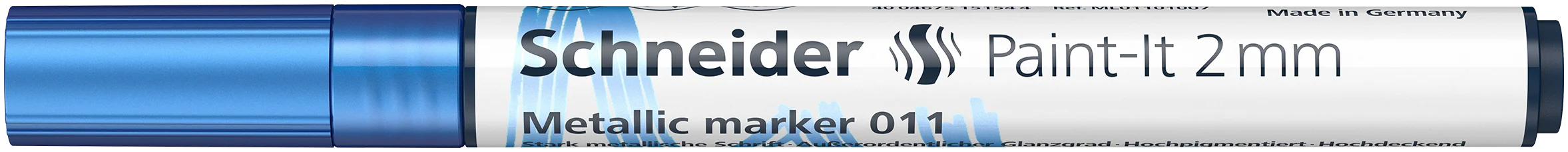 Metallic marker voor buitengewone effecten. Ronde punt voor een fijne lijnbreedte van ca. 2 mm. Schrijfkleur blue metallic red metallic yellow metallic green metallic. Nieuwe pigmenttechnologie maakt een schone en homogene kleurtoepassing mogelijk. De met kleurpigmenten omhulde aluminiumdeeltjes geven een zeer metaalachtig effect met een uitzonderlijk hoge glansgraad, zelfs bij verschillende lichtinvallen. Geschikt voor vele ondergronden. Beste resultaten op donkere en niet-absorberende ondergronden. Sneldrogende inkt perfect gecontroleerd door een klep.