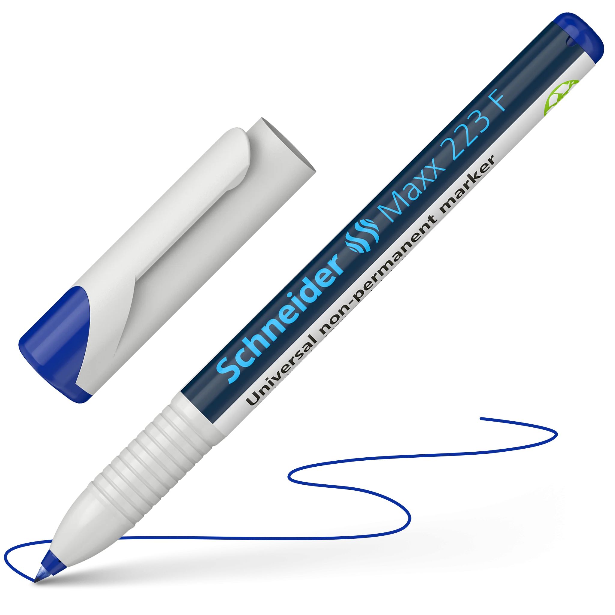 Non-permanente universele marker met schrijfbreedte Fine (F) ca. 0,7 mm. Schrijfkleur blauw. Voor het beschrijven van transparante folie (OHP), papier, kunststof, glas, metaal en bijna alle andere materialen. De kleuren zijn intensief, sneldrogend, watervast en lichtbestendig. De Cap-off-inkt droogt niet uit, ook wanneer de marker 2-3 dagen zonder dop blijft liggen. De marker is nagenoeg reukloos en zonder Tolueen en Xyleen. Dunne potloodmodel stift met praktische dop met clip. Milieuvriendelijk en grondstofbesparende houder gemaakt van 92 % gerecycled plastic.