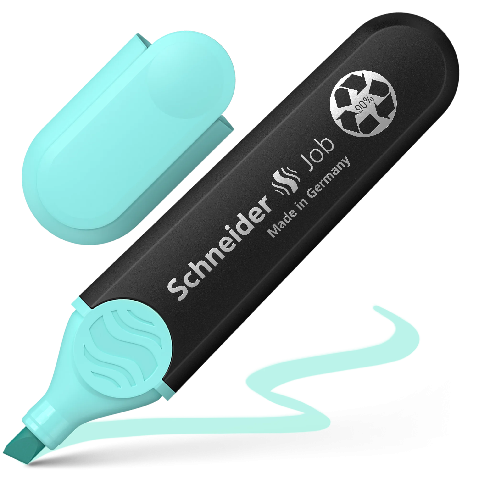 Tekstmarker met beitelpunt voor 2 lijnbreedtes, 1 + 5 mm. Schrijfkleur turquoise. De Job markeerstift is de eerste markeerstift gemmaakt van meer dan 90% gerecycled plastic die het wereldberoemde ecolabel \"Blauwe Engel\" heeft gekregen. De houder, het interne reservoir en de punt zijn gemaakt van gerecycled plastic. De inkt is gemaakt van biologisch materiaal. De universele inkt voor standaard-, kopieer- en faxpapier heeft intensieve kleuren en is zeer lichtbestendig. Hierdoor is de Job markeerstift ideaal voor gebruik op school, universiteit of kantoor en met de beitelvormige punt ook perfect voor creatief werk in een bullet journal, voor kalligrafie of handlettering. Met zijn grote inktvoorraad markeert de Job meer dan 15.000 woorden.