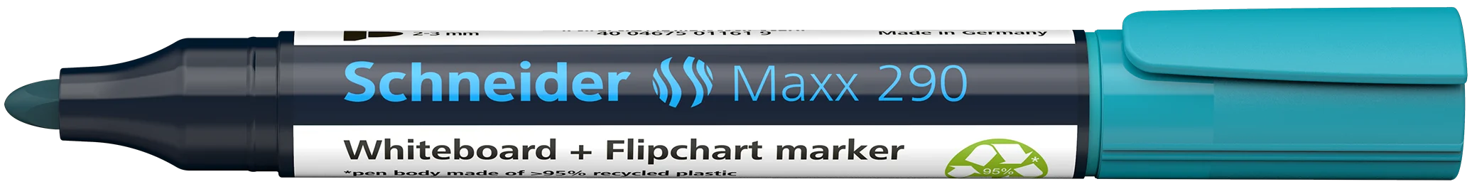 Whiteboard en flipchart marker met ronde punt, lijnbreedte 2 - 3 mm. Schrijfkleur blauw. *Behuizing bestaat uit 95% recycling-kunststof. Zowel op een whiteboard als op papier, de sterke, intensieve kleuren zijn makkelijk te lezen, ook achterin de zaal. De inkt kan verwijderd worden van whiteboarden met een droge doek zonder dat er restanten achterblijven en bij flipcharts drukt het niet door op het volgende vel. De Cap-Off inkt droogt niet uit, zelfs niet als de marker 2-3 dagen zonder dop ligt. Het is nagenoeg reukloos en bevat geen Tolueen en Xyleen. De nieuwe grotere houder bevat meer inkt voor maximum resultaat en de nieuwe ronde punt schrijft aangenaam zacht zonder geluid. De Maxx 2990 heeft een praktische dop met clip.