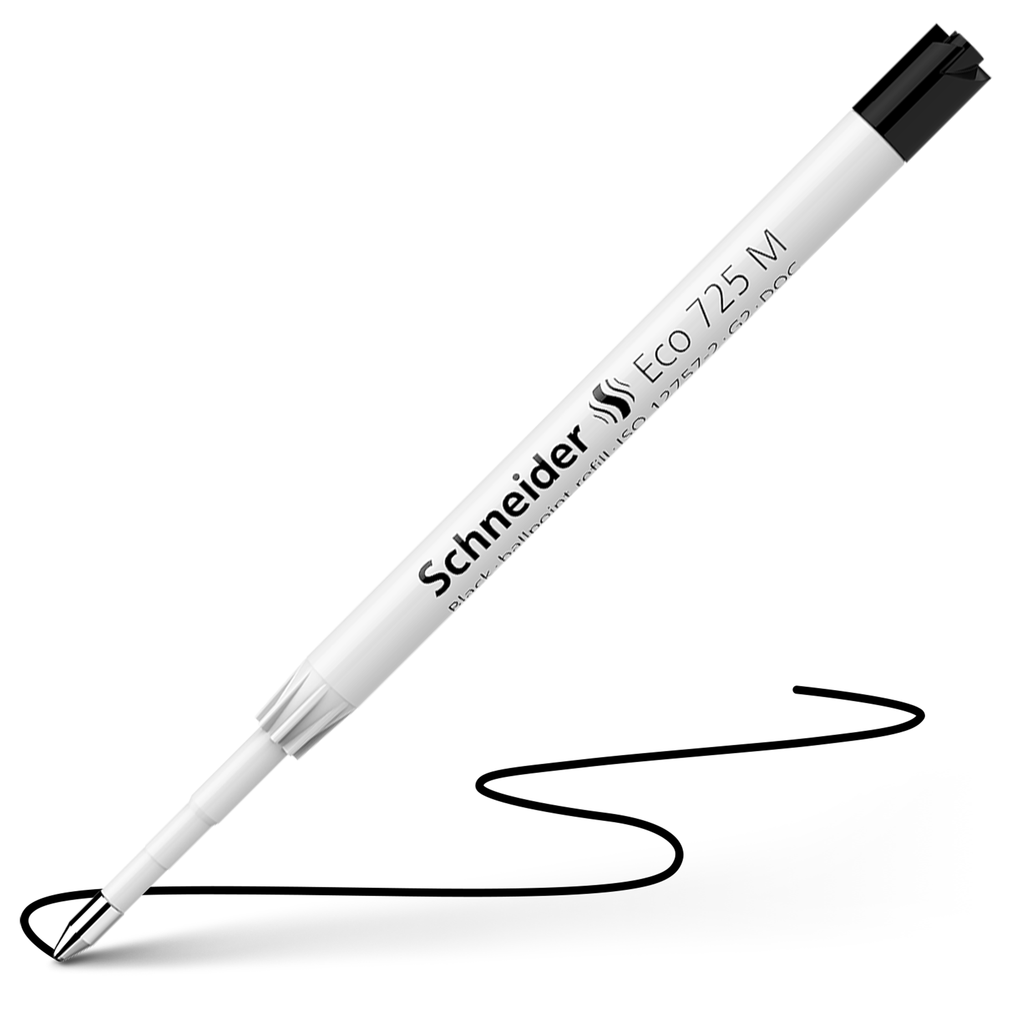 Gigantyczny wklad w formacie ISO G2 z *korpusem uzupelniajacym wykonanym zostal w 954z tworzywa sztucznego pochodzacego z recyklingu, ograniczylismy emisje CO2 o 70% w porównaniu z konwencjonalnym tworzywem sztucznym. Wodoodporny zgodnie z ISO 12757-2, szerokosc linii w medium (M). Kolor czarny. Posiada ekoetykiete \"Blue Angel\". Wklad odpowiedni do dlugopisu Reco i wszystkich pozostalych dlugopisów marki Schneider z grupy Plug & Play, a takze pasujacy do dlugopisów innych marek. Dzieki przyjemnemu, lekkiemu i stalemu przeplywowi tuszu, Eco 725 zapewnia wygodne pisanie bez efektu rozmazania. Odporna na scieranie koncówka ze stali nierdzewnej gwarantuje, ze tusz moze byc wykorzystany do ostatniej kropli i nie rozmazuje sie.