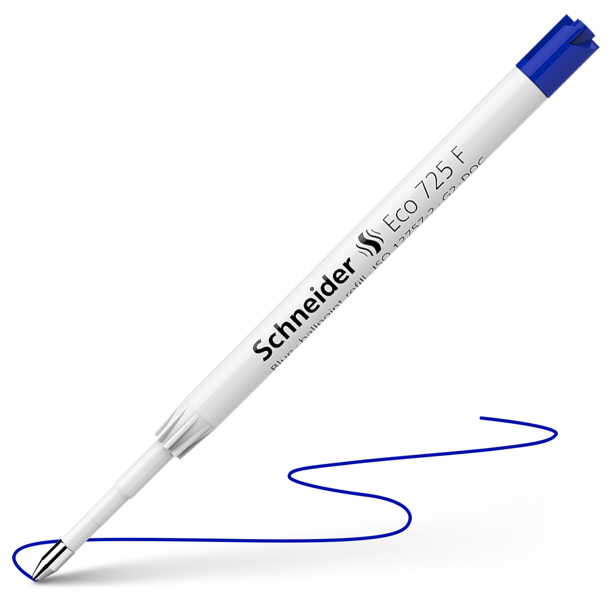 Gigantyczny wklad w formacie ISO G2 z *korpusem uzupelniajacym wykonanym zostal w 94% z tworzywa sztucznego pochodzacego z recyklingu, ograniczylismy emisje CO2 o 70% w porównaniu z konwencjonalnym tworzywem sztucznym. Wodoodporny zgodnie z ISO 12757-2, szerokosc linii w Cienka (F). Kolor niebieski . Posiada ekoetykiete \"Blue Angel\". Wklad odpowiedni do dlugopisu Reco i wszystkich pozostalych dlugopisów marki Schneider z grupy Plug & Play, a takze pasujacy do dlugopisów innych marek. Dzieki przyjemnemu, lekkiemu i stalemu przeplywowi tuszu, Eco 725 zapewnia wygodne pisanie bez efektu rozmazania. Odporna na scieranie koncówka ze stali nierdzewnej gwarantuje, ze tusz moze byc wykorzystany do ostatniej kropli i nie rozmazuje sie.