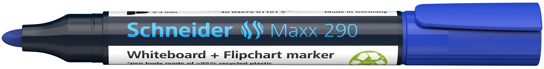 Marker do tablic i flipchartów z okragla koncówka, grubosc linii 2-3 mm. Kolor pisma: niebieski. *Obudowa jest wykonana z 95% tworzywa sztucznego nadajacego sie do odzysku. Intensywny kolor pisma na tablicy i papierze jest dobrze czytelny nawet z ostatnich rzedów. Z tablicy bardzo latwo daje sie zetrzec na sucho, a na flipcharcie nie przebija na kolejne kartki. System „cap off” zapobiega wysychaniu nawet gdy pozostanie nie zamkniety przez 2-3 dni. Jest prawie bezwonny i nie zawiera toluenu ani ksylenu. Nowy masywny format zapewnia najwyzsza wydajnosc, a innowacyjna okragla koncówka umozliwia przyjemne, miekkie pisanie bez niemilego odglosu skrzypienia. Maxx 290 posiada praktyczna skuwke z klipem, a tusz jest uzupelniany za pomoca stacji napelniajacej Maxx 665.
