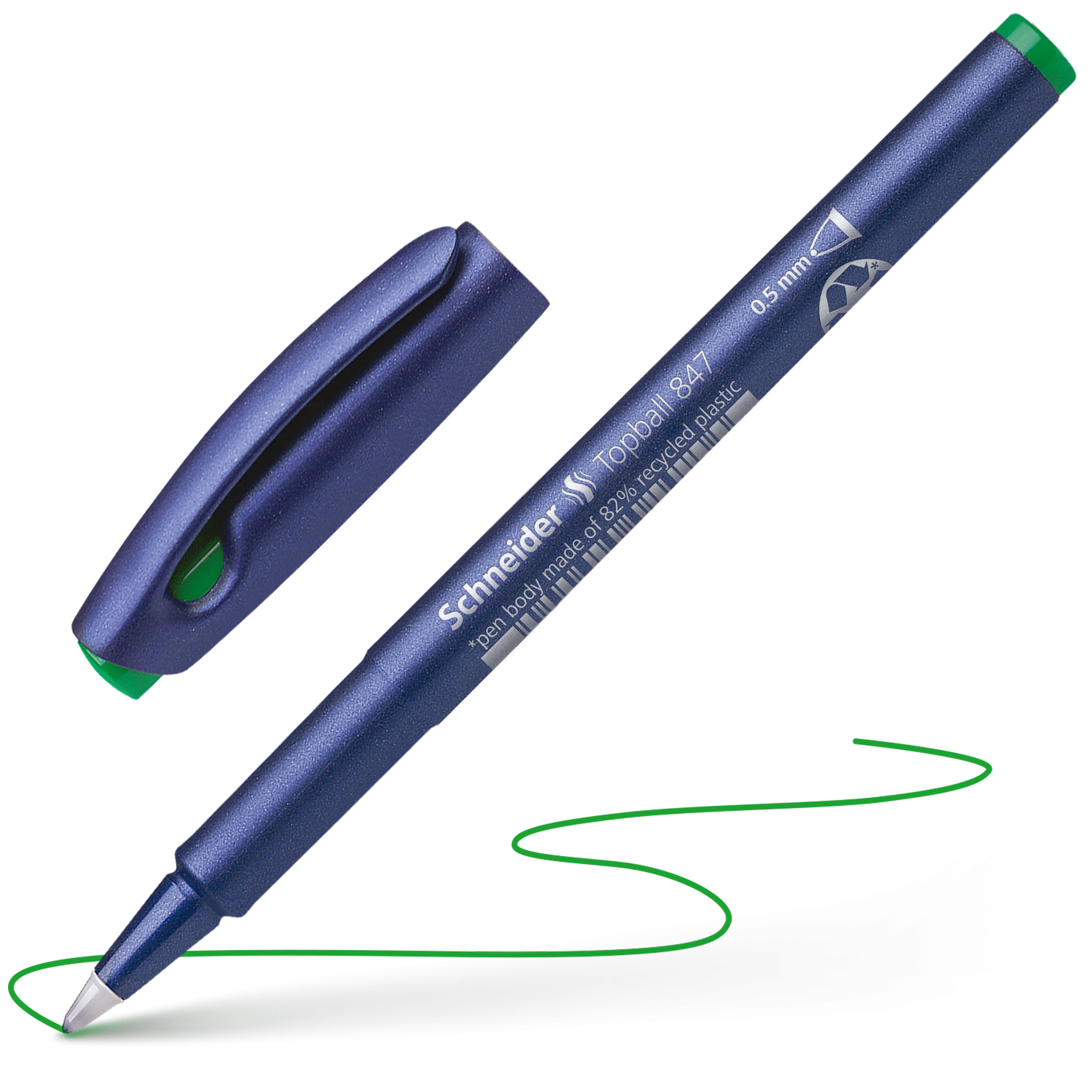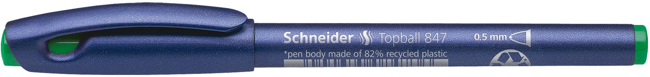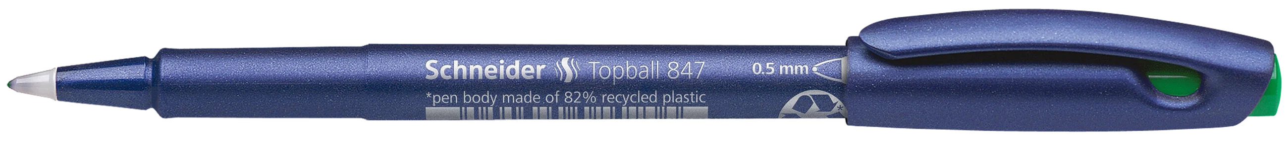 Pióro kulkowe z koncówka stozkowa z tworzywa, grubosc linii ok. 0,5 mm. Kolor pisma: zielony. Elastycznie ulozona kulka umozliwia przyjemne, miekkie pisanie. Przyjazna dla srodowiska obudowa wykonana w 82% z recyklingowanego plastiku. System „cap off” zapobiega wysychaniu nawet gdy pozostanie nie zamkniety przez 2-3 dni.