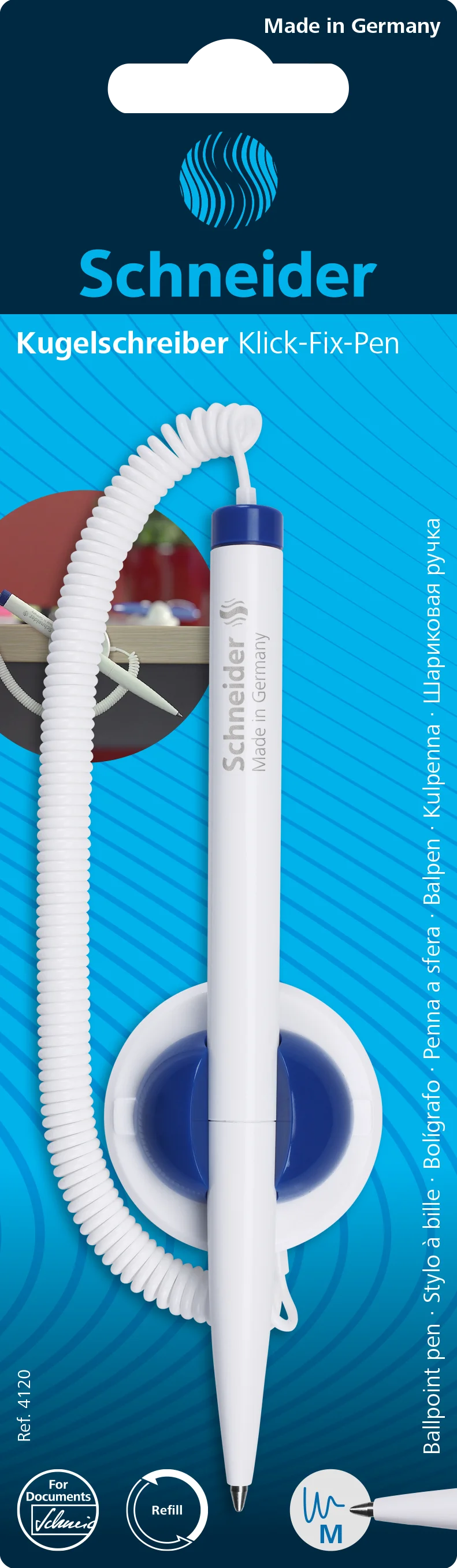 Kordonlu ve tutuculu tükenmez kalem. Yazar kasa, telefon, araba gibi bir tükenmez kalemin sabit olarak kullanildigi her yer için ideal. Klick-Fix kendiliginden yapisir ve tutucu istenilen pozisyona dogru çevrilebilir. Mavi yazi rengi. ISO 12757-2 standardina göre dokümanlara uygun mürekkep. Degistirilebilir dev yedek Express 775 (M). Asinmaya dayanikli paslanmaz çelik uç, büyük mürekkep kartusunun tam olarak kullanilmasini ve bulasmamasini garanti eder.