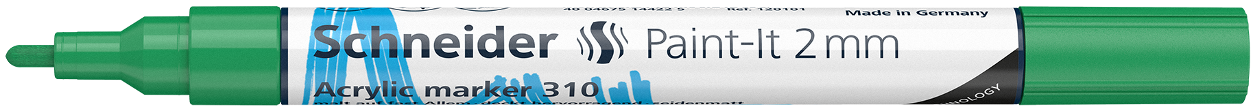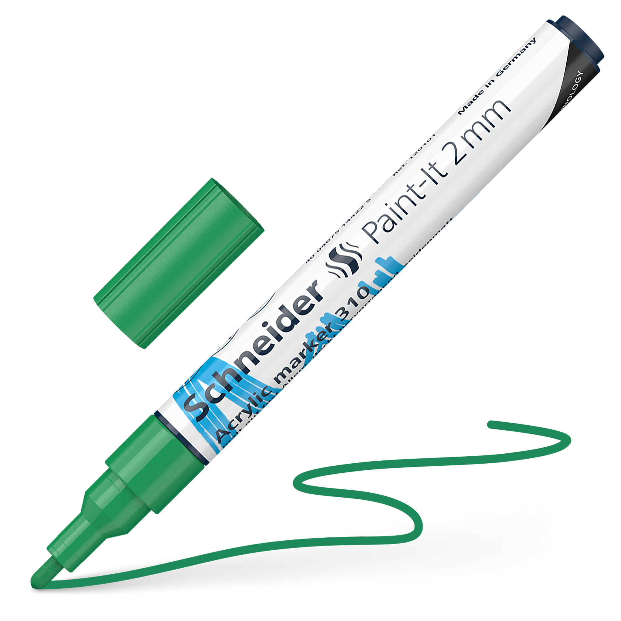 Acrylic marker 2 mm for creative work. Writing colour green. The right tool for any of your projects. High coverage, quick-drying and high colour brilliance. The optimised ink is suitable for almost any substrate: wood, metal, paper, cardboard, stone, etc. The water-based and odourless ink is perfectly controlled by a valve, to suit your needs.