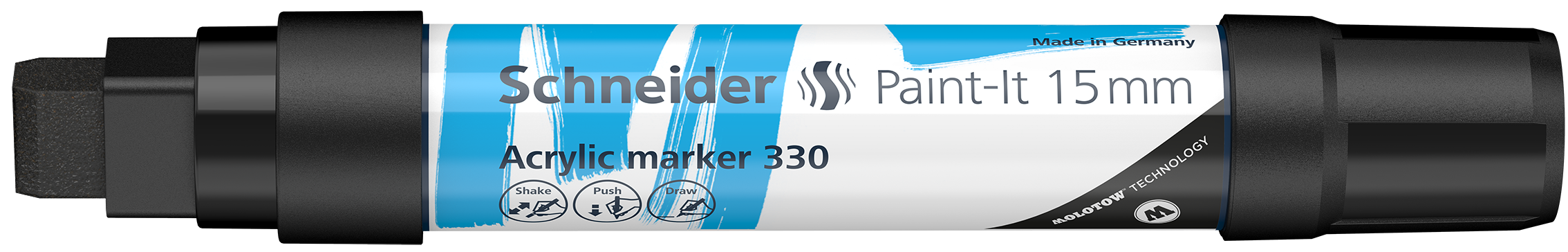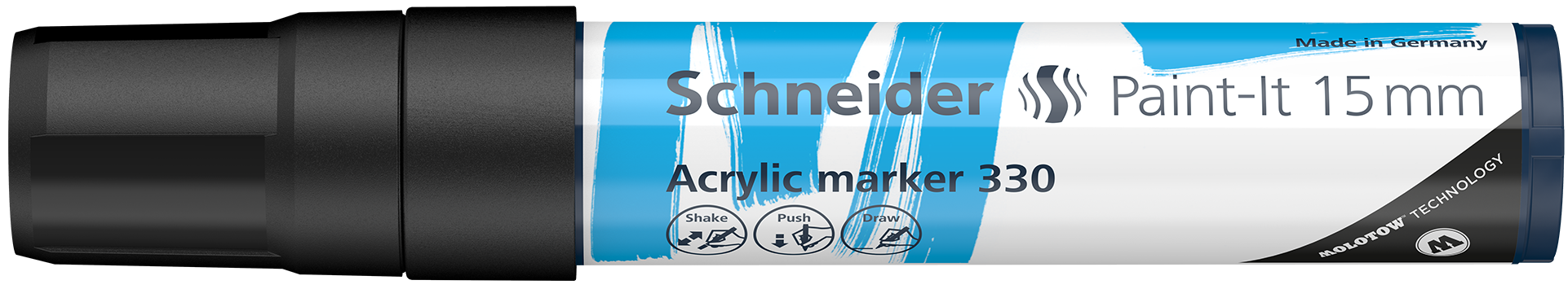 Acrylic marker 15 mm for creative work. Writing colour black. The right tool for any of your projects. High coverage, quick-drying and high colour brilliance. The optimised ink is suitable for almost any substrate: wood, metal, paper, cardboard, stone, etc. The water-based and odourless ink is perfectly controlled by a valve, to suit your needs.