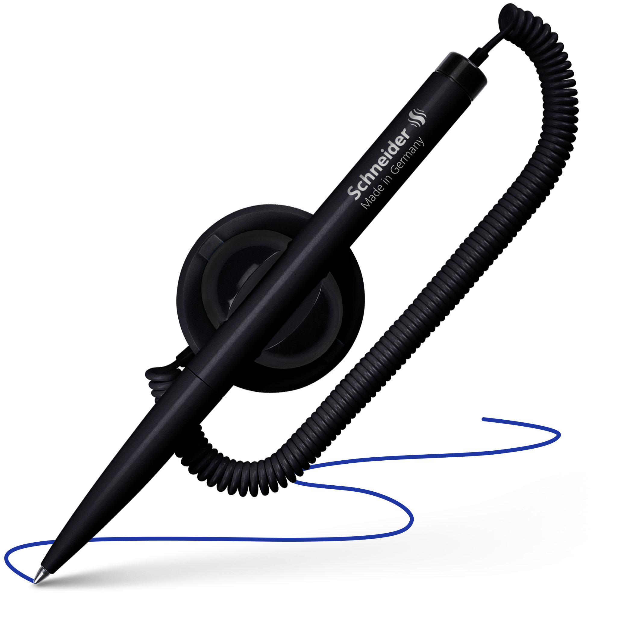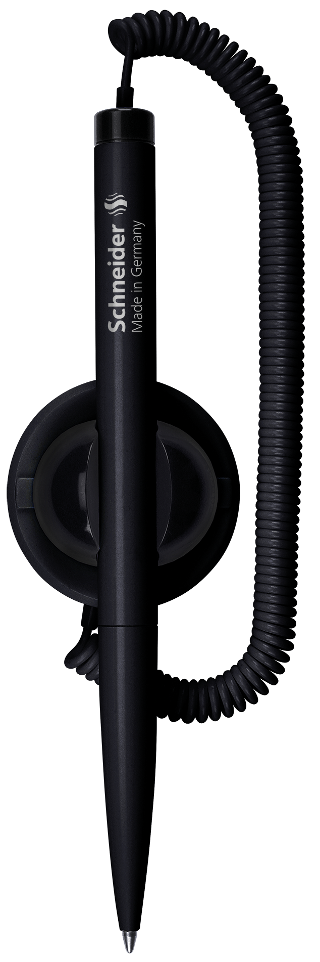Ballpoint pen with expandable cord and pen holder. Ideal for places where a ballpoint pen is required at a particular location, e.g. at a cash desk, by the telephone, in the car, etc. The Klick-Fix is self-adhesive and its jaws can be turned to any required position. Writing colour black. With replaceable refill Express 775 Medium (M). Waterproof according to ink standard ISO 12757-2. The wear-resistant stainless steel tip guarantees that the large ink supply can be fully used and does not smear.