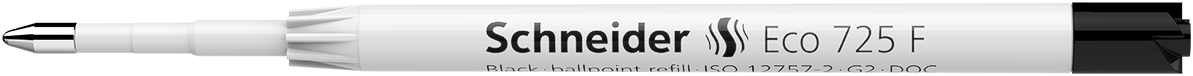 Giant refill in ISO format G2 with *refill body made of 94 % recycled plastic, saving more than 70% CO2 emissions compared to conventional plastic. Waterproof according to ISO 12757-2, fine line width (F). Writing colour black. Certified with the eco-label \"Blue Angel\" suitable as refill for the Reco ballpoint pen and all Schneider ballpoint pens with Plug+Play system as well as many other brands. Due to the pleasantly light and constant ink flow, Eco 725 ensures a clean and comfortable writing. The wear-resistant stainless steel tip guarantees that the large ink supply can be fully used and does not smear.