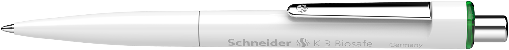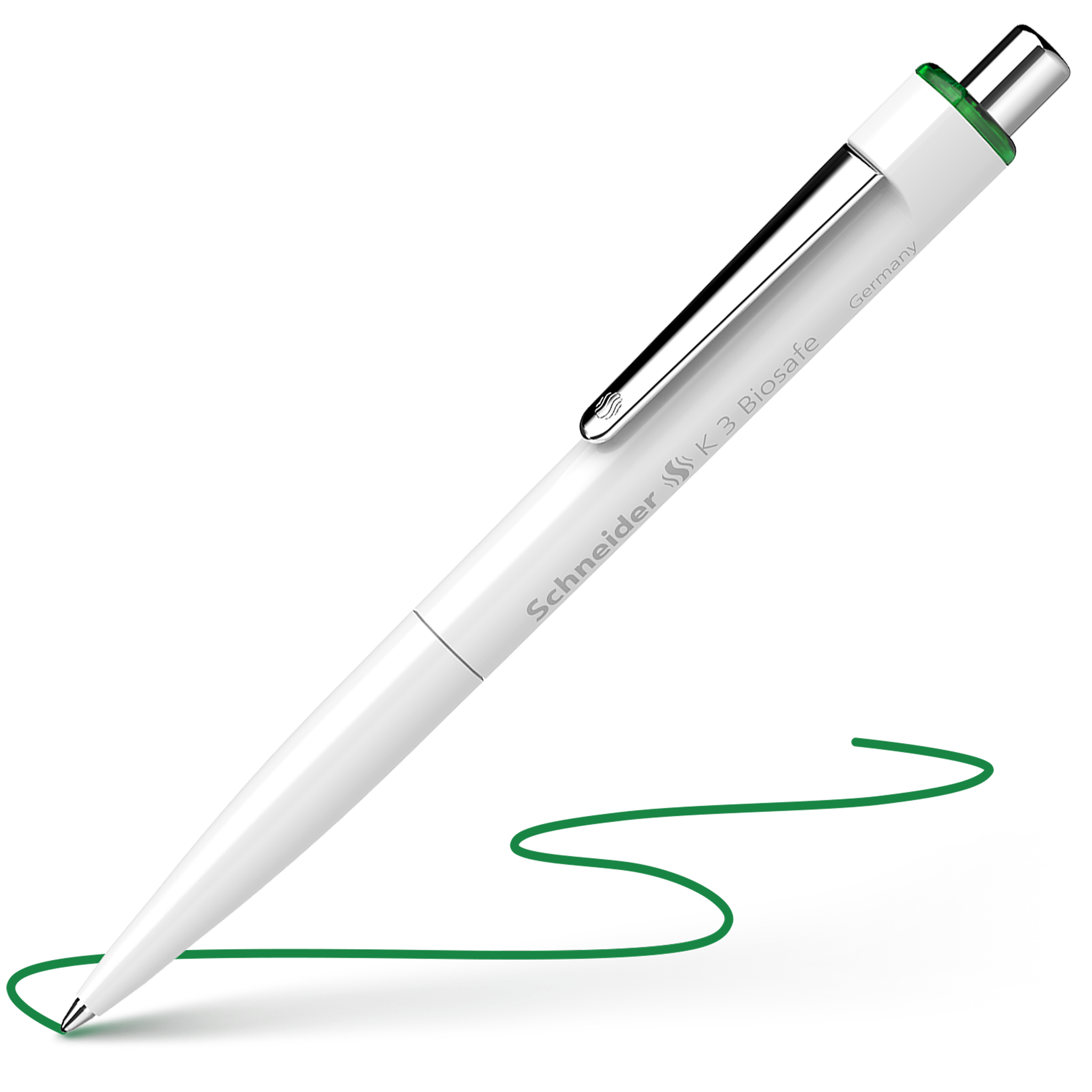 Ballpoint pen with pen body made from over 80 % biobased plastic. Clip and push button made of metal. Writing colour green. With replaceable giant refill Medium (M), waterproof according to ink standard ISO 12757-2. The wear-resistant stainless steel tip guarantees that the large ink supply can be fully used and does not smear. Thanks to the clever Plug+Play system, the K 3 Biosafe pen can use a variety of refill formats.