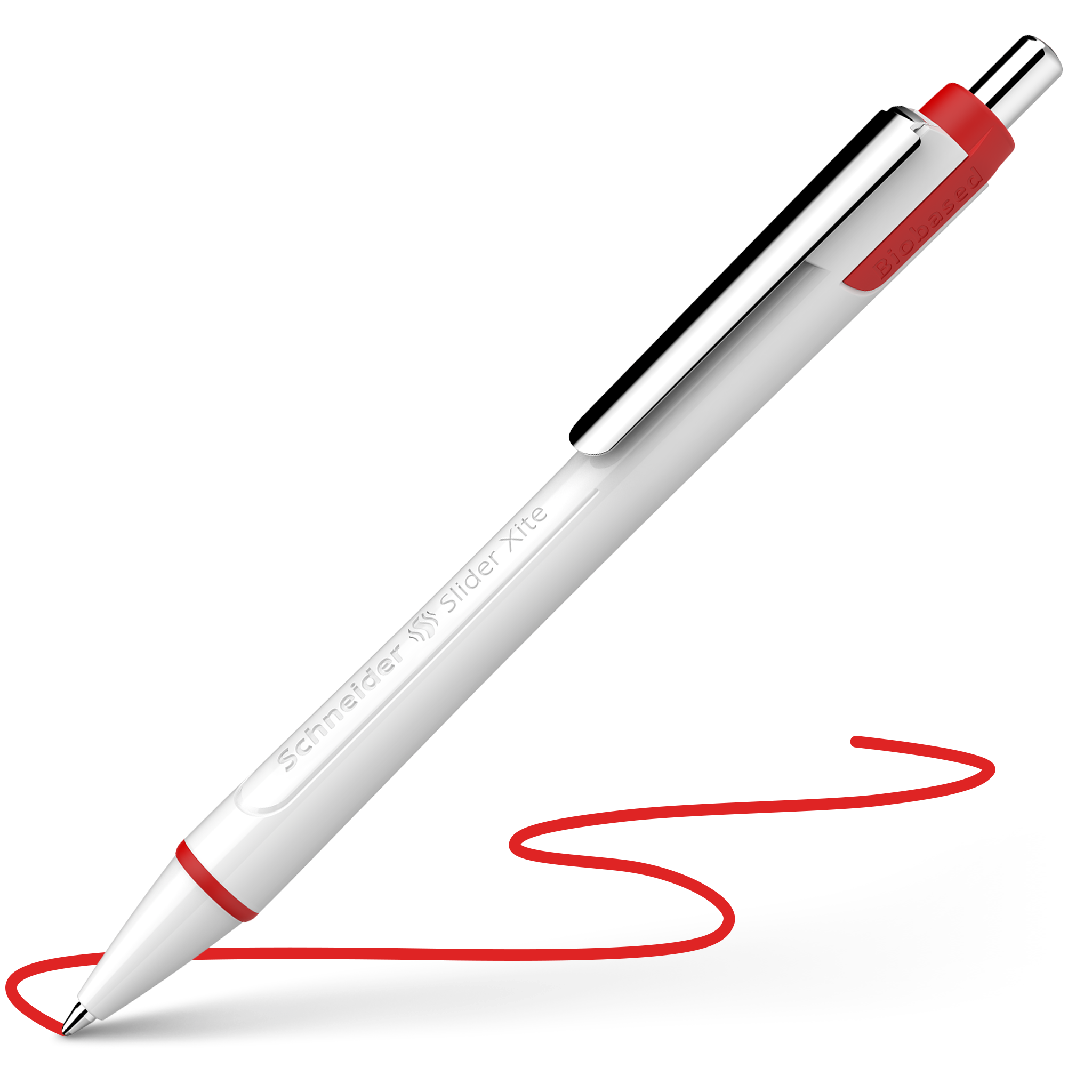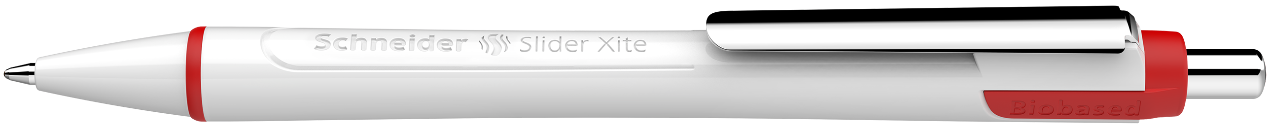 Ballpoint pen with pen body made from 70% biobased plastics. Viscoglide® technology for extraordinarily smooth and gliding writing. Slider Xite is equipped with a replaceable metal refill Slider 710 XB with wear-resistant stainless steel tip. This guarantees that the large ink supply can be fully used and does not smear. Ink dries quickly - even on smooth paper - and is smudge proof when highlighting it later on. Writing colour red. The ink colour is recognisable at the push button. The slightly concave-shaped barrel promotes tireless and relaxed writing. It has a sturdy metal clip and, thanks to the clever Plug+Play system, can use a variety of refill formats. Product with financial climate contribution: the purchase of the product supports a certified climate protection project.