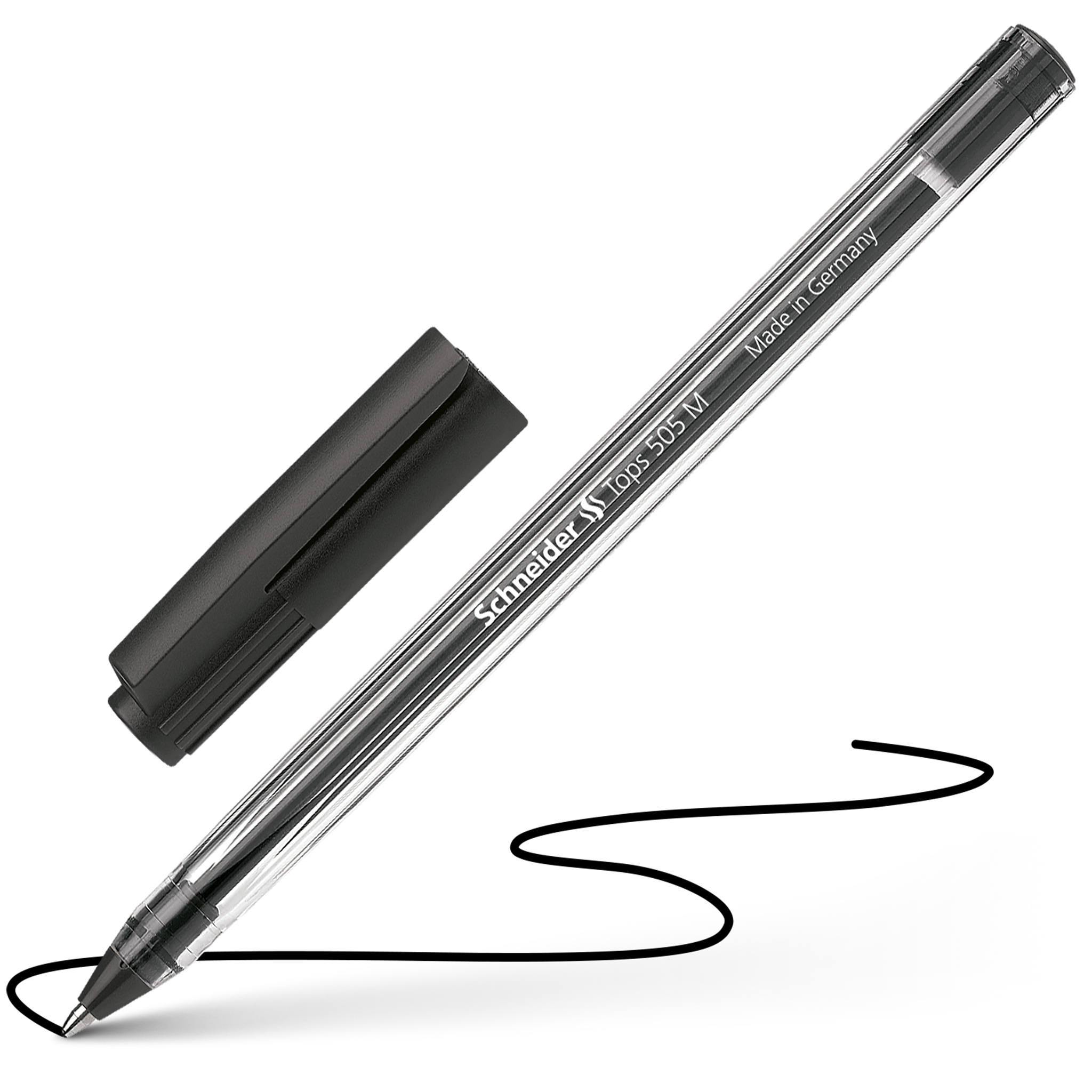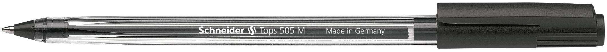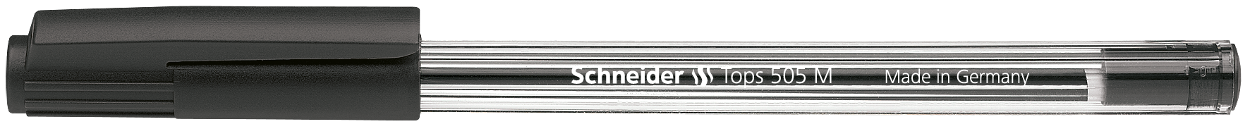 Ballpoint pen with clip cap that fits neatly on either end of the pen. The cap/stopper colour matches the writing colour: black. Medium line width (M), approx. 0.5 mm. The ink level is visible through the transparent barrel. The wear-resistant stainless steel tip guarantees that the large ink supply can be fully used and does not smear.