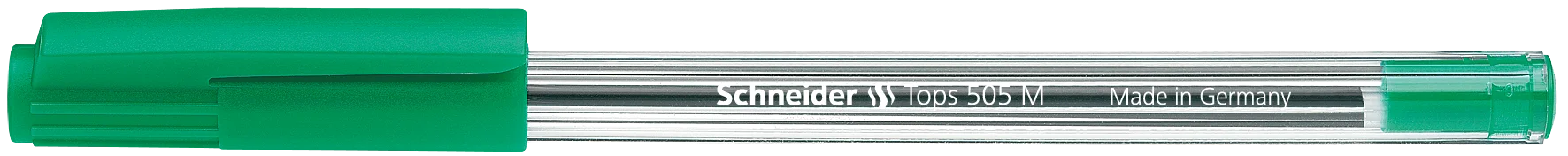 Ballpoint pen with clip cap that fits neatly on either end of the pen. The cap/stopper colour matches the writing colour: green. Medium line width (M), approx. 0.5 mm. The ink level is visible through the transparent barrel. The wear-resistant stainless steel tip guarantees that the large ink supply can be fully used and does not smear.