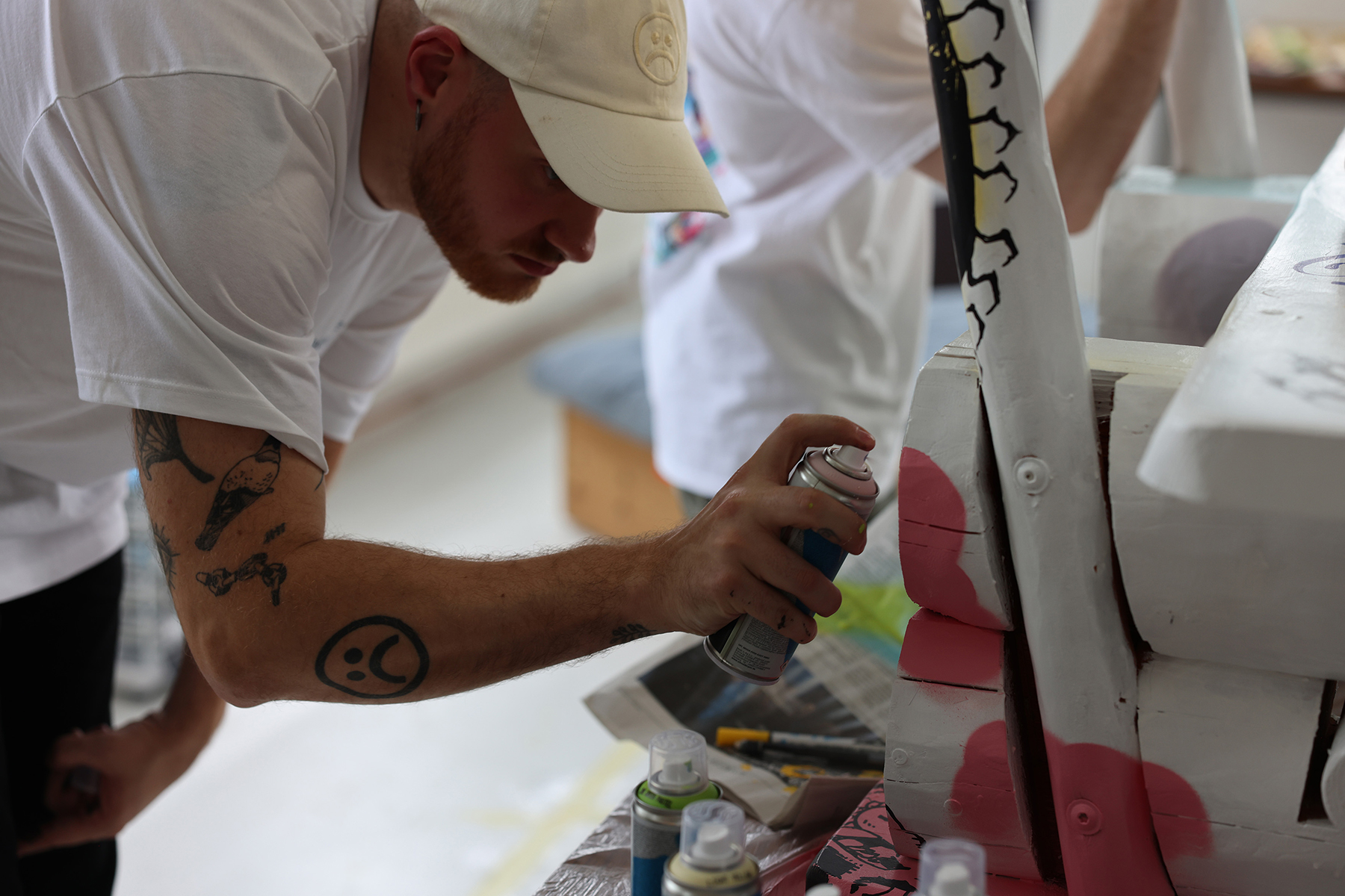 There, the group enjoyed a creative afternoon with relaxed music in the special atmosphere of this extraordinary location. In small groups, the creatives transformed white wooden benches into unique works of art by painting, writing, and spraying them. Each participant expressed their own individual artistic style and took on the challenge of working on unfamiliar surfaces – with great success and a lot of fun.