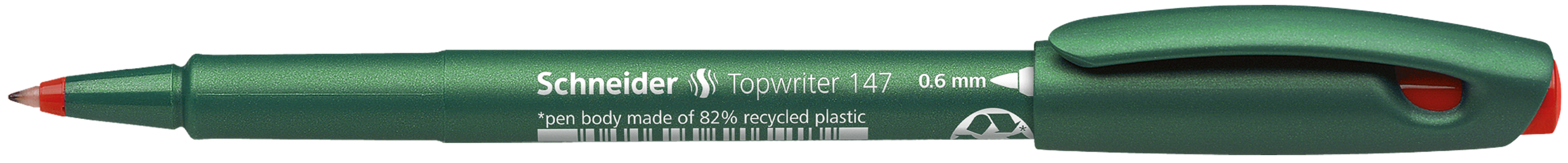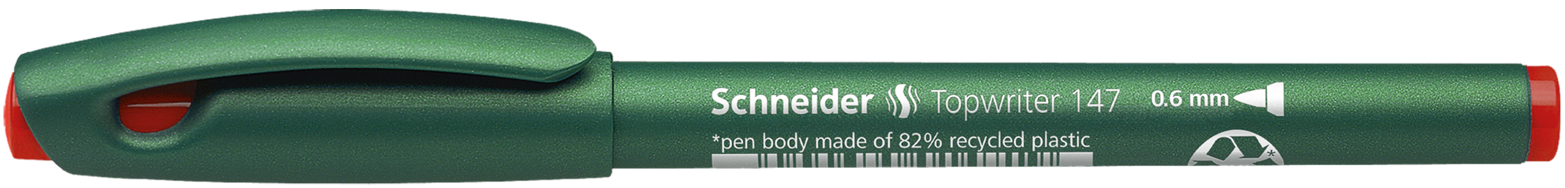 Fibrepen with hard fibre tip for comfortable and striking writing, approx. 0.6 mm. Writing colour red. The cap-off ink does not run dry even if the cap is removed for 2-3 days. Eco-friendly and resource-saving *pen body made of 82 % recycled plastic. The barrel parts are made from anti-evaporation PP for long-term shelf-life.
