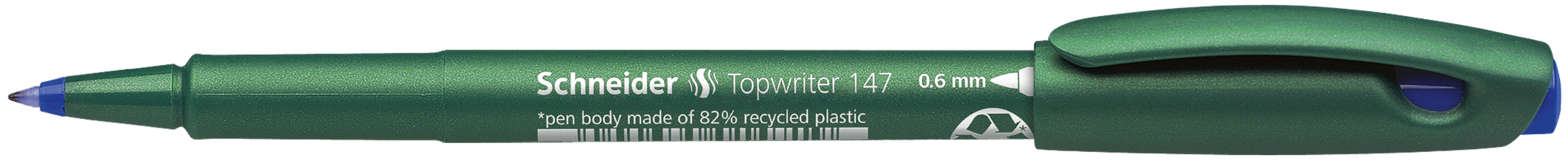 Fibrepen with hard fibre tip for comfortable and striking writing, approx. 0.6 mm. Writing colour blue. The cap-off ink does not run dry even if the cap is removed for 2-3 days. Eco-friendly and resource-saving *pen body made of 82 % recycled plastic. The barrel parts are made from anti-evaporation PP for long-term shelf-life.