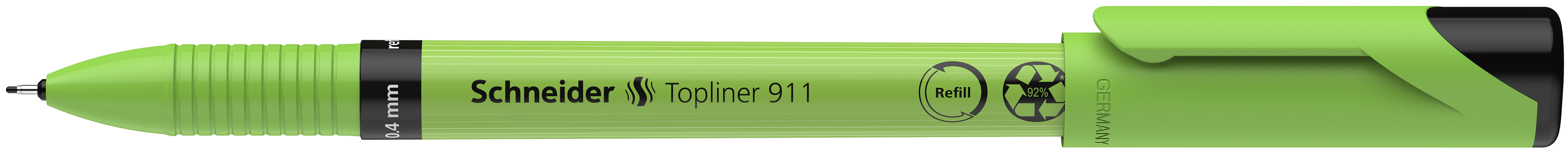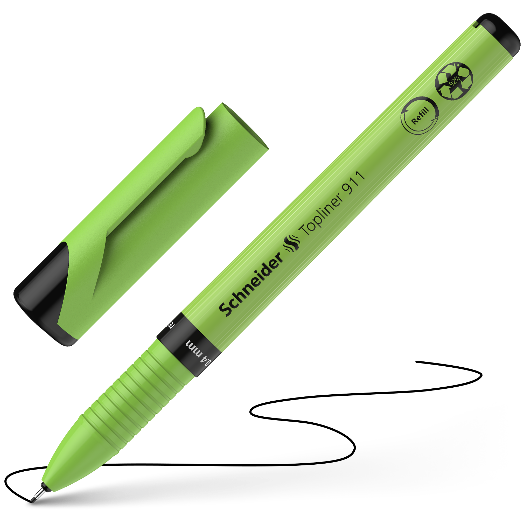 Fineliner with exchangeable and European size Topliner 970 refill impresses with its particularly environmentally friendly and resource-saving production. The pen body is made of 92% recycled plastic. Metal-encased writing tip for fine and exact writing, approx. 0.4 mm, even enables you to work with a ruler and template. Writing colour black. The cap-off ink does not run dry even if the cap is removed for 2-3 days. The Topliner 911 can be refilled with European size ink refills.