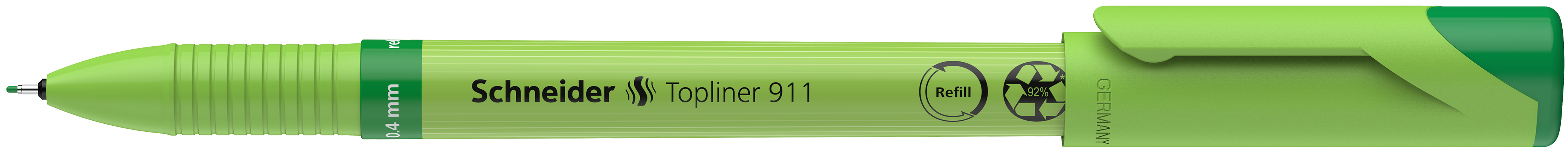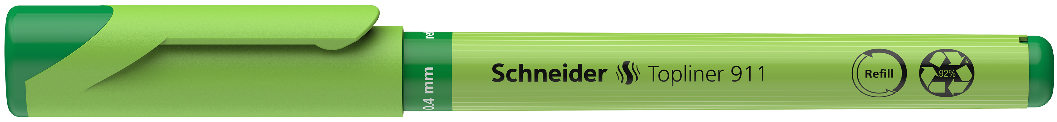 Fineliner with exchangeable and European size Topliner 970 refill impresses with its particularly environmentally friendly and resource-saving production. The pen body is made of 92% recycled plastic. Metal-encased writing tip for fine and exact writing, approx. 0.4 mm, even enables you to work with a ruler and template. Writing colour green. The cap-off ink does not run dry even if the cap is removed for 2-3 days. The Topliner 911 can be refilled with European size ink refills.