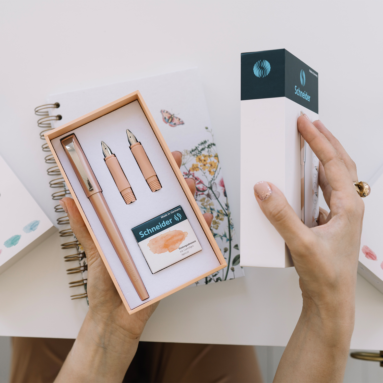 Unique pastel ink gift set with 4 reclosable ink containers with 15 ml ink and 1 piston converter for easy, environmentally friendly refilling of ink from the ink glass. Perfect for creative minds who want to personalise their writing and impress when bullet journaling, handlettering or writing letters, greeting cards, invitations and place cards. Content: 4 × ink containers pastel with 15 ml in lemon cake, blush, rose, cognac, 1 × piston converter.