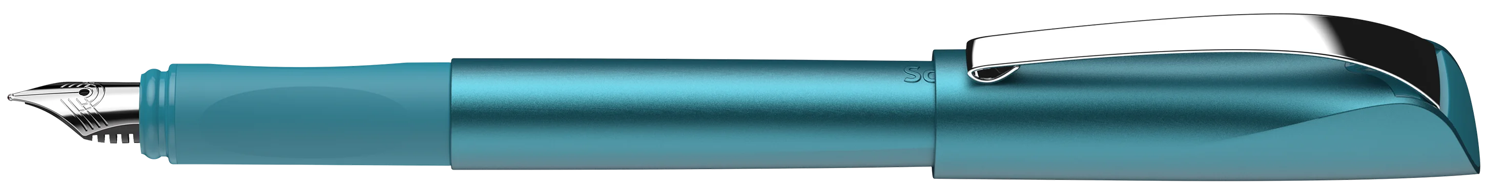 Fountain pen with ergonomically rubberised grip profile and high-quality stainless steel nib with iridium tip M. Modern design with elegant metallic look in colour \"teal\" and striking curves. Equipped with a sturdy metal clip and standard ink cartridge, royal blue, erasable. Spare front part available. Equally suitable for right and left-handers.