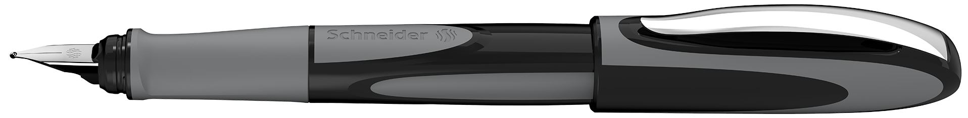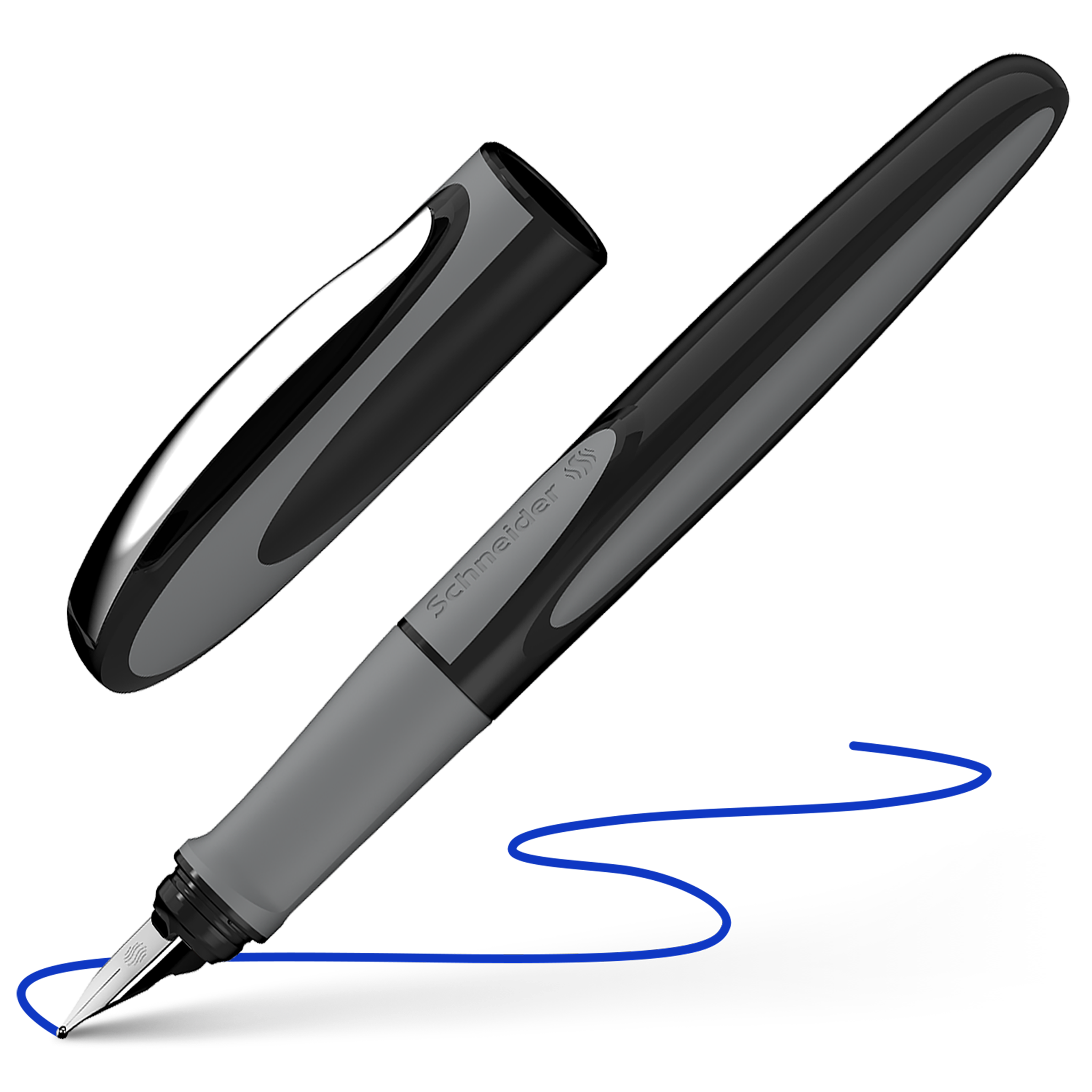 Fountain pen Ray with its futuristic design, which combines modernity, lifestyle and sportiness is conquering classrooms, offices and universities. The fountain pen for left-handers in colour \"onyx” with ergonomically rubberised grip profile is suitable for adults, children and school beginners. The high-quality stainless steel nib with iridium tip L provides exceptionally smooth, clean writing. The nib is very stable and can be replaced if necessary. The cap has a sturdy stainless steel clip. The fountain pen is suitable for standard ink cartridges and piston converters and incl. 1 standard ink cartridge royal blue erasable. There is a reverse version M+ for right-handed users.