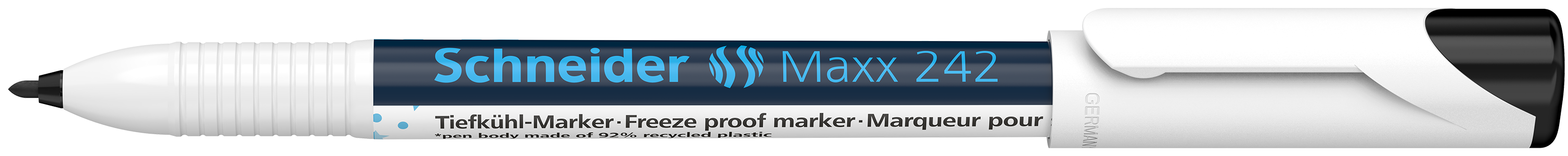 Is it the vegetables from last week or is it the steaks after all With the new freeze proof marker Schneider Maxx 242, the guesswork is over. Frost-resistant to -25⁰C, the marker reliably labels everything that goes into the freezer. With a line thickness of 1 mm and black ink, the writing is easily legible on almost all surfaces and makes it easier to find things quickly in the freezer. The lettering is permanent and abrasion-resistant on freezer bags and freezer labels, but can be removed again from smooth plastic cans and glass containers. Surprise meals are definitely a thing of the past. Approved for indirect contact with foodstuffs in accordance with VO (EU) No. 1935/2004 and Swiss Commodities Ordinance VO, the ink is also harmless to health.