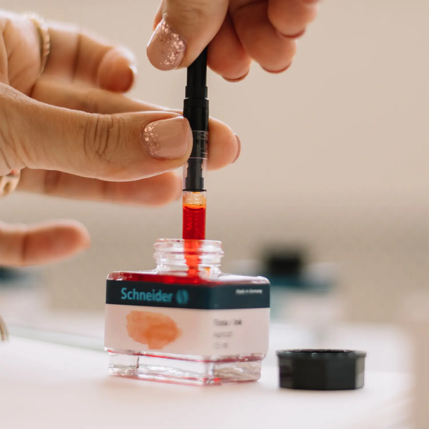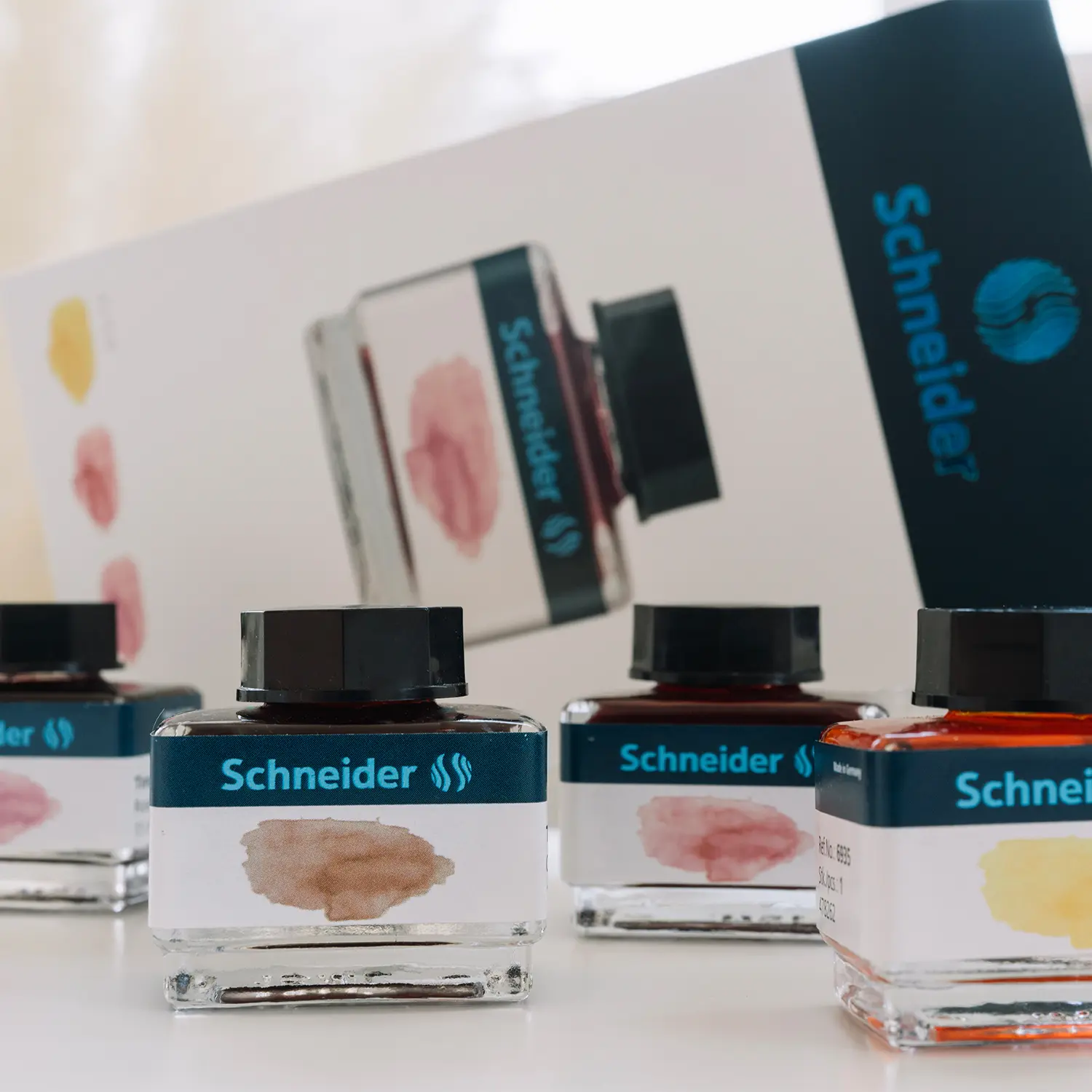 Unique pastel ink gift set with 4 reclosable ink containers with 15 ml ink and 1 piston converter for easy, environmentally friendly refilling of ink from the ink glass. Perfect for creative minds who want to personalise their writing and impress when bullet journaling, handlettering or writing letters, greeting cards, invitations and place cards. Content: 4 × ink containers pastel with 15 ml in lemon cake, blush, rose, cognac, 1 × piston converter.
