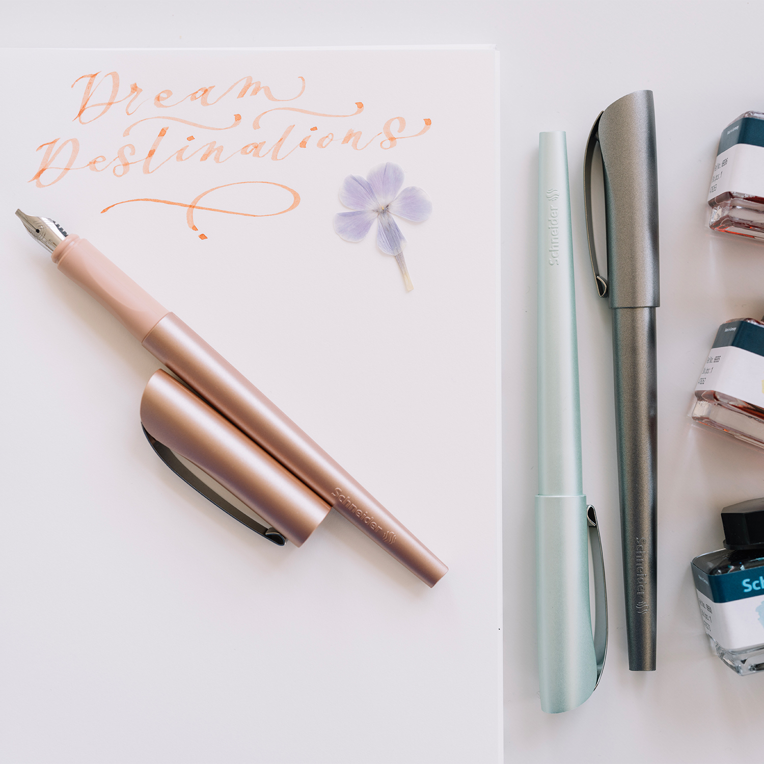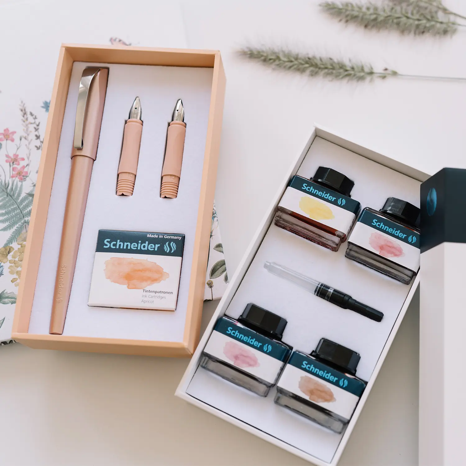 With the Callissima, calligraphic writing is a breeze thanks to the flattened and straight nib. The calligraphy fountain pen is refined with a soft metallic shimmering surface. The slim barrel and ergonomic grip make this fountain pen easy to hold and promotes precise writing for special handwriting. Perfect for creative minds who want to personalise their writing and impress when bullet journaling, handlettering or writing letters, greeting cards, invitations and place cards. Body colour \"apricot\"and nib width 1.5 mm for an expressive typeface. This fountain pen is equipped with an ink cartridge in the colour \"apricot\". It is suitable for both right- and left-handers and is available in two other line widths (1.1 mm, 1.8 mm). With the separately available Callissima front parts, the line width can be changed at will for different typefaces.