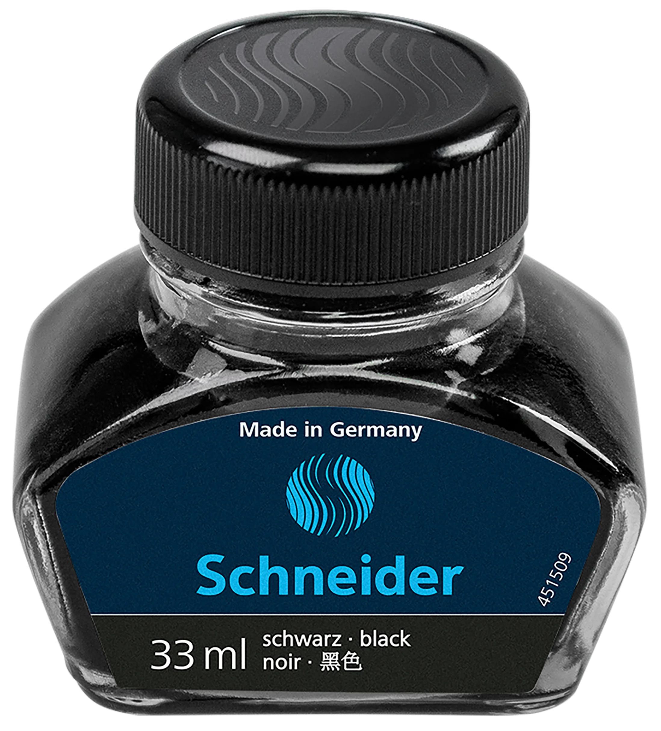 Reclosable ink container with 33 ml liquid ink in colour \"black\" for easy, environmentally friendly refilling of fountain pens and rollerballs with piston converter.