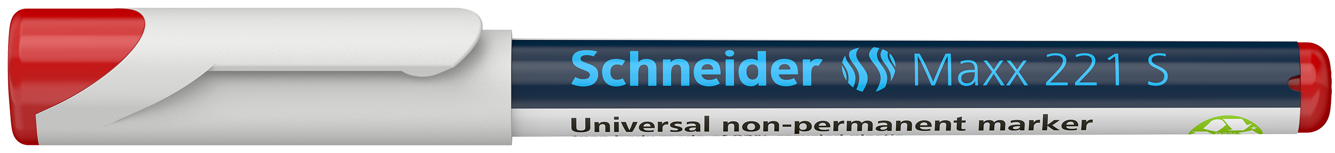 Non-permanent universal marker, superfine line width (S) approx. 0.4 mm. Writing colour red. For writing on transparencies (OHP), paper, plastic, glass, metal and almost all other materials. This non-permanent marker is ideal for the office, in school or in the craft business. Whether on wall calendars, films or on sticky notes, the Schneider Maxx 221 does not shine through on paper, is color-vibrant, quick-drying and can still be wiped-off easily with a moist cloth. It has a low odour and is free of toluol and xylol. Slim pocket model with practical clip cap. Eco-friendly and resource-saving *pen body made of 92% recycled plastic.