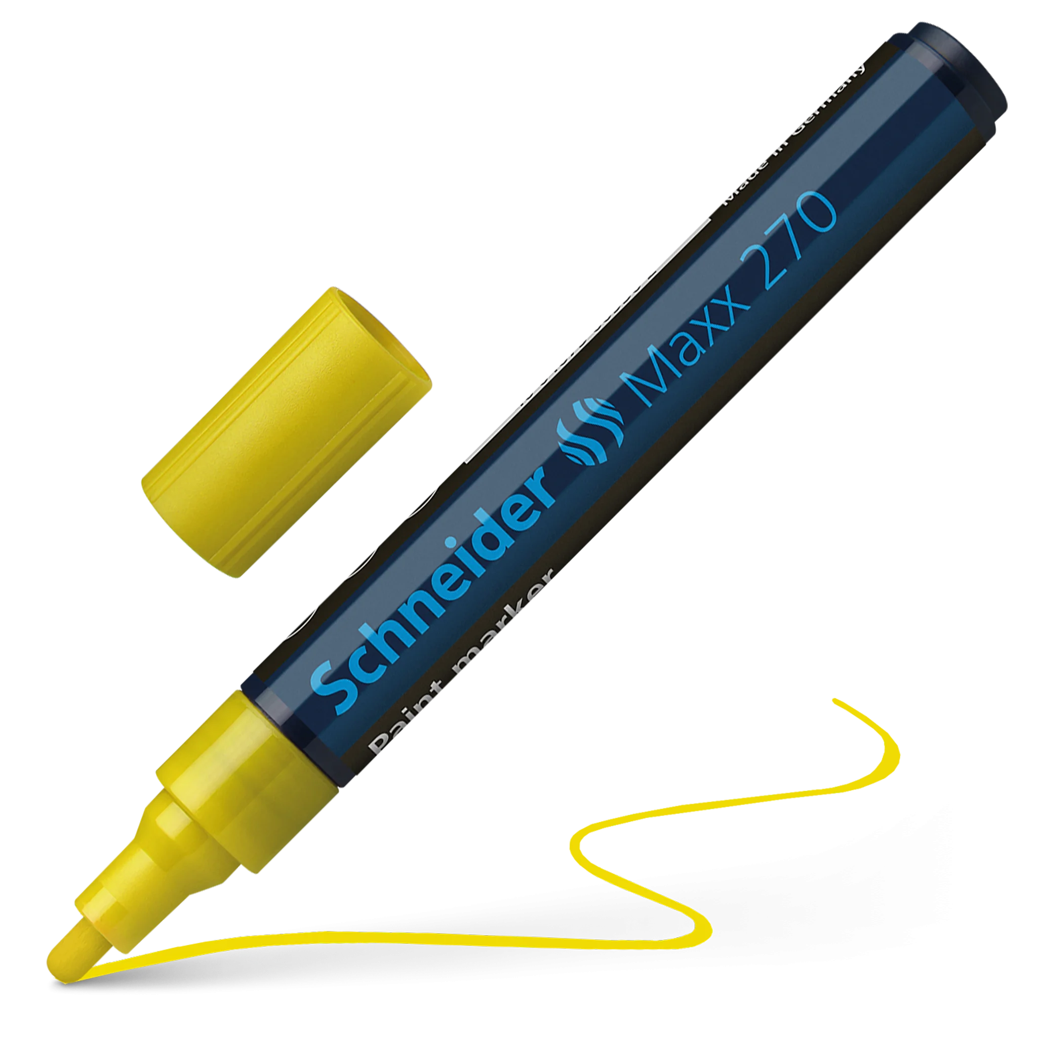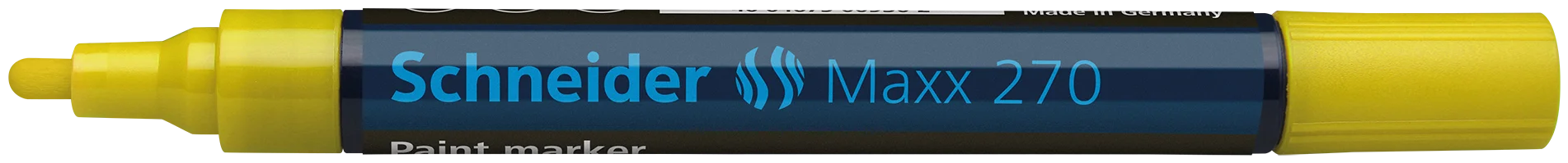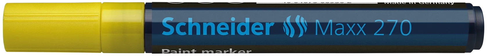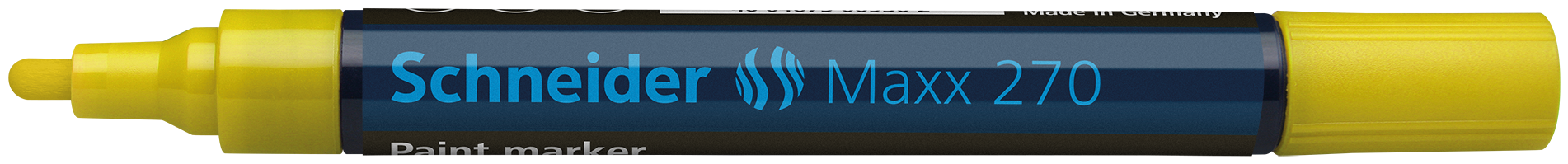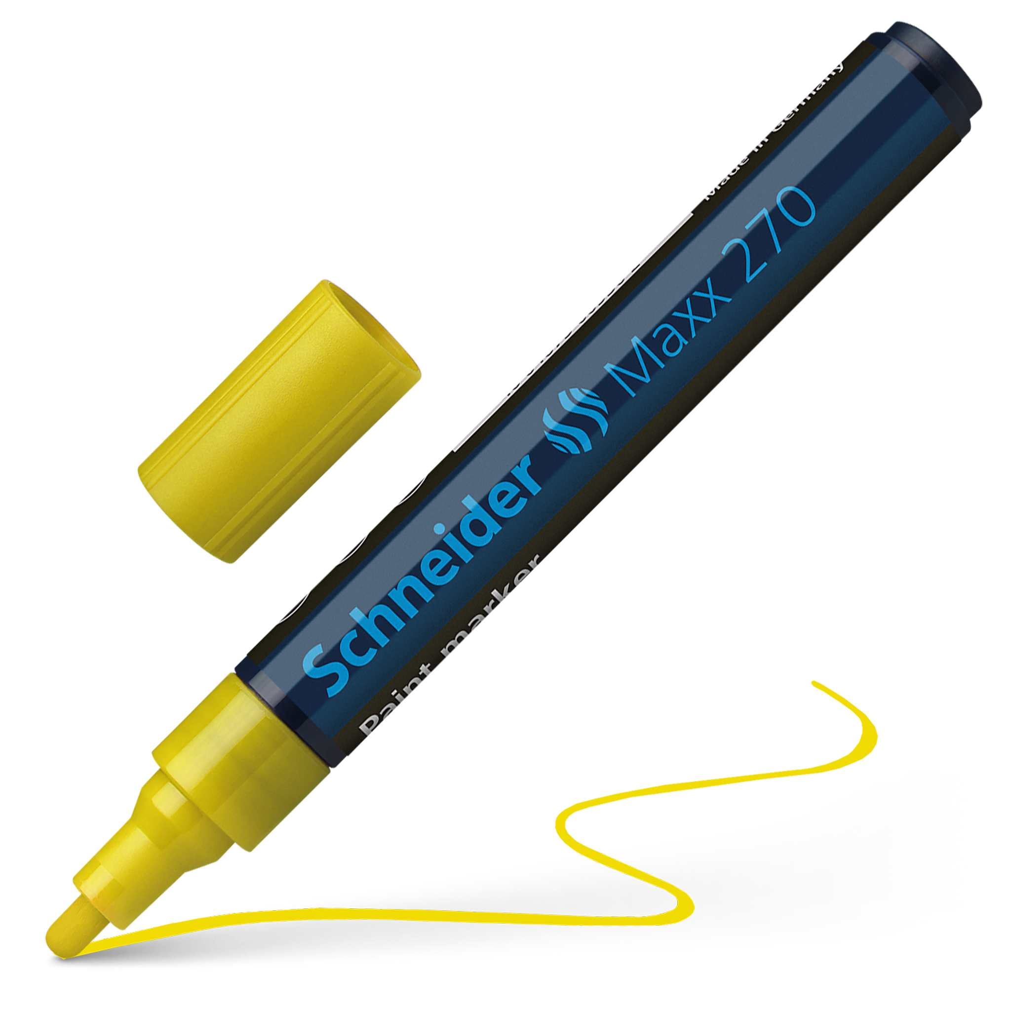 Paint marker with bullet tip for a strong line width of 1-3 mm. Writing colour yellow. Ideal for marking and decorating rough and smooth surfaces, e.g. paper, plastic, glass, ceramics, metal, leather, rubber, etc. The marks made are highly opaque, have very good adhesion and abrasion resistance on almost all materials, are lightfast, water and weatherproof, resistant to many etching and washing procedures, as well as heat-resistant to up to 300 °C. The ink is controlled by a valve and is free of toluol and xylol. Individually shrink-wrapped ex works, replaceable writing tip.