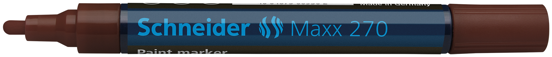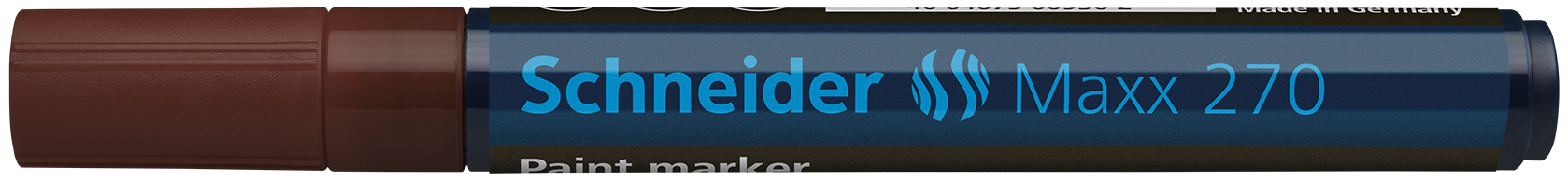 Paint marker with bullet tip for a strong line width of 1-3 mm. Writing colour brown. Ideal for marking and decorating rough and smooth surfaces, e.g. paper, plastic, glass, ceramics, metal, leather, rubber, etc. The marks made are highly opaque, have very good adhesion and abrasion resistance on almost all materials, are lightfast, water and weatherproof, resistant to many etching and washing procedures, as well as heat-resistant to up to 300 °C. The ink is controlled by a valve and is free of toluol and xylol. Individually shrink-wrapped ex works, replaceable writing tip.