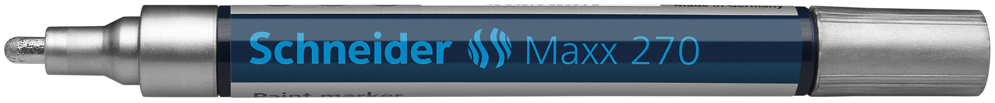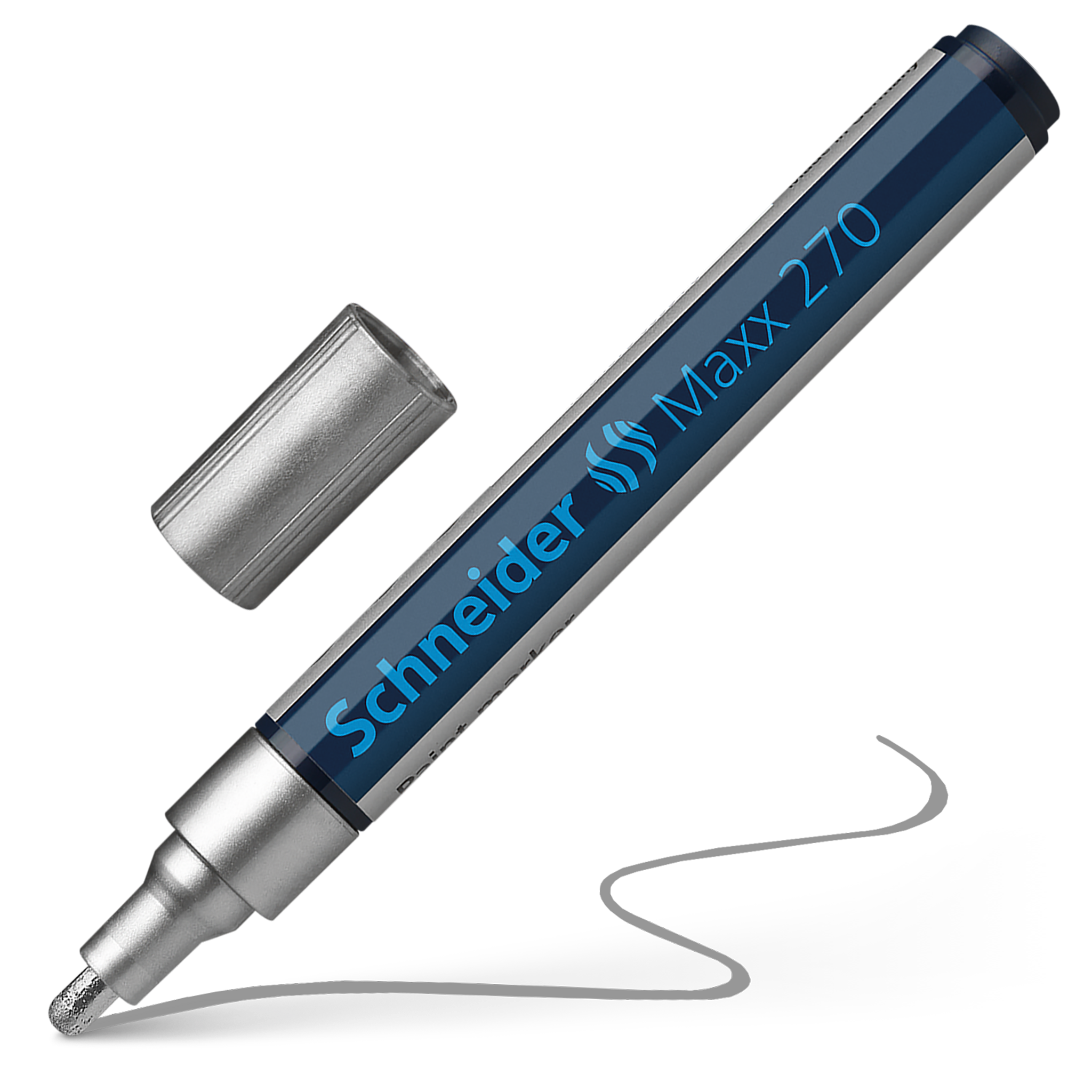 Paint marker with bullet tip for a strong line width of 1-3 mm. Writing colour silver. Ideal for marking and decorating rough and smooth surfaces, e.g. paper, plastic, glass, ceramics, metal, leather, rubber, etc. The marks made are highly opaque, have very good adhesion and abrasion resistance on almost all materials, are lightfast, water and weatherproof, resistant to many etching and washing procedures, as well as heat-resistant to up to 300 °C. The ink is controlled by a valve and is free of toluol and xylol. Individually shrink-wrapped ex works, replaceable writing tip.