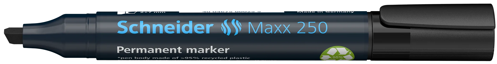 This flexible permanent marker is indispensable for every workplace. It allows slim writing or broad marking and withstands any weather. Chisel tip, line widths 2+7 mm. Writing colour black. *Housing consists of 95% recycled plastic. For writing on cardboard, paper, plastic, glass, metal, wood and almost all other materials. The writing is quick-drying, water-proof and highly light resistant. The cap-off ink does not run dry even if the cap is removed for 2-3 days. It has a low odour and is free of toluol and xylol. The marker has a practical clip cap and can be refilled eco-friendly using Maxx 669 refill station.