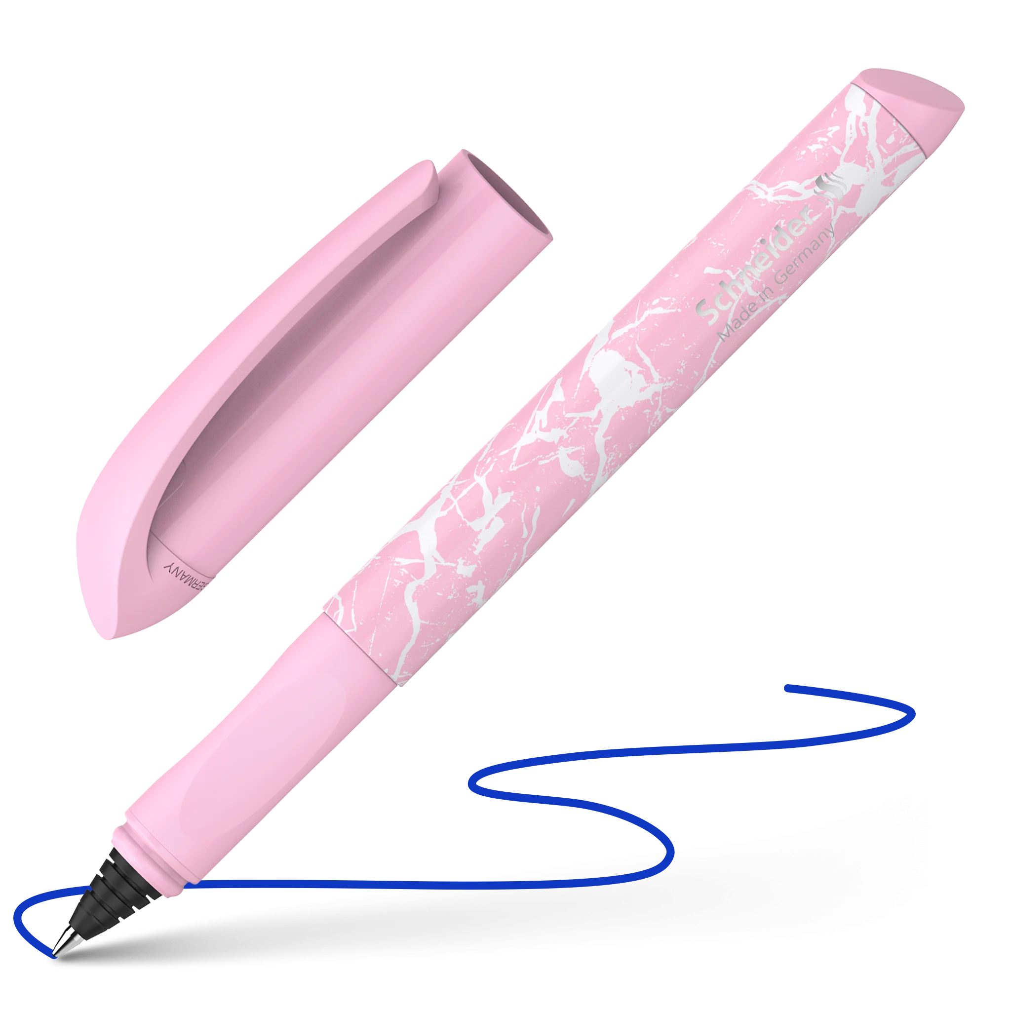 Rollerball in colour \"bubblegum\" with ergonomically rubberised grip profile and wear-resistant stainless steel tip. Attractive design on barrel, robust plastic clip and standard ink cartridges in royal blue, erasable. Equally suitable for both left-handed and right-handed users.