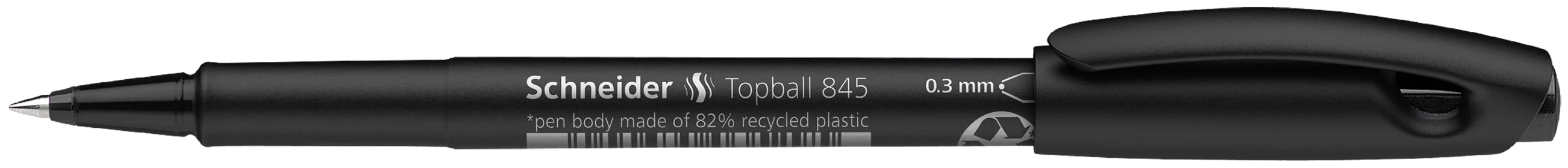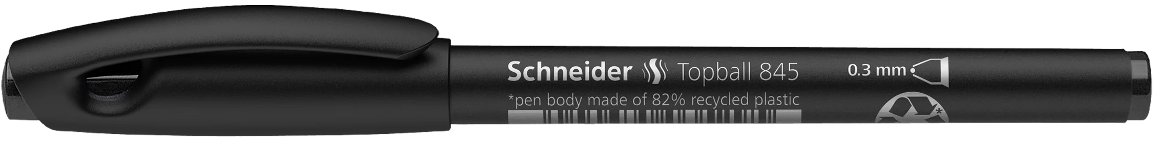 Rollerball for ultra-fine writing results. With conical tip made from wear-resistant stainless steel, line width approx. 0.3 mm, writing colour black. Eco-friendly and resource-saving *pen body made of 82% recycled plastic. The cap-off ink does not run dry even if the cap is removed for 2-3 days.