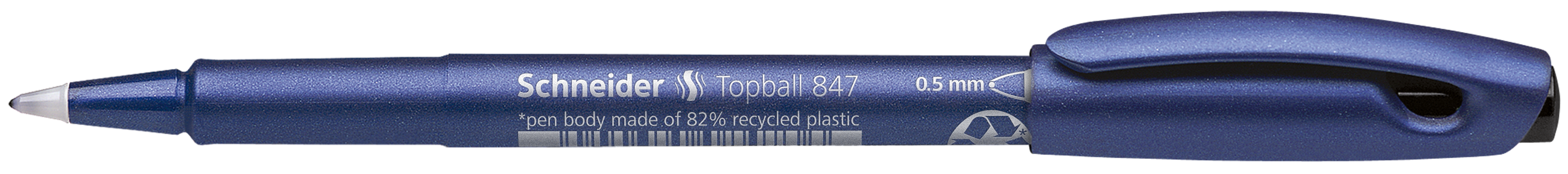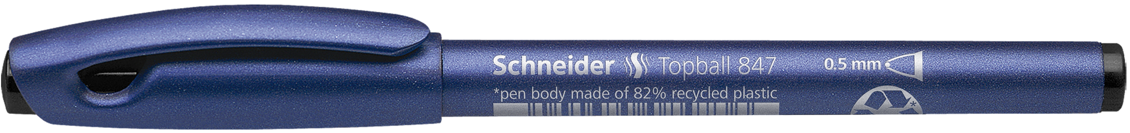 Rollerball with plastic conical tip, line width approx. 0.5 mm. Writing colour black. The elastic bearing of the ball ensures a pleasantly soft writing experience. Eco-friendly and resource-saving *pen body made of 82% recycled plastic. The cap-off ink does not run dry even if the cap is removed for 2-3 days.