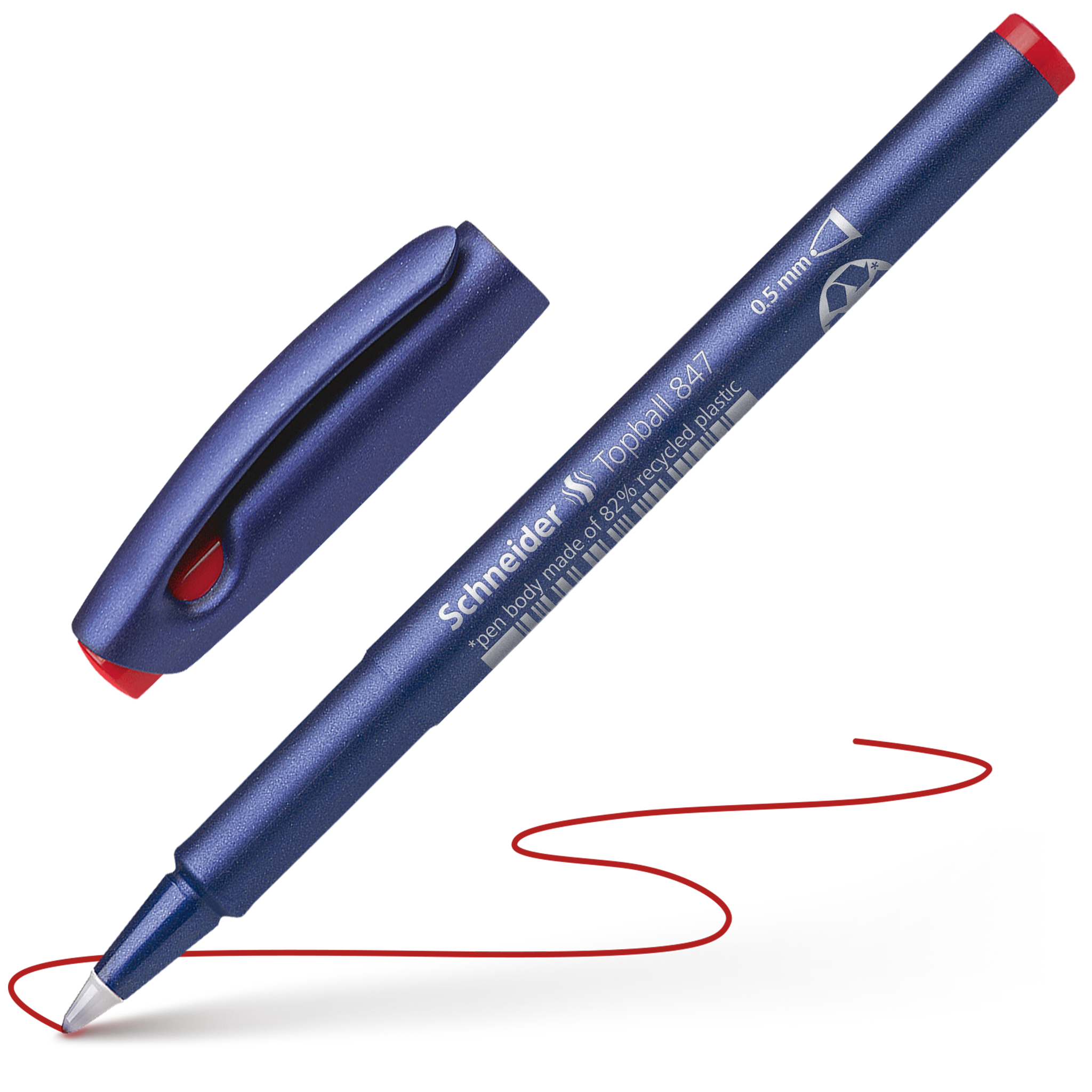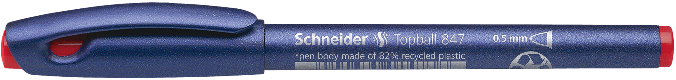 Rollerball with plastic conical tip, line width approx. 0.5 mm. Writing colour red. The elastic bearing of the ball ensures a pleasantly soft writing experience. Eco-friendly and resource-saving *pen body made of 82% recycled plastic. The cap-off ink does not run dry even if the cap is removed for 2-3 days.