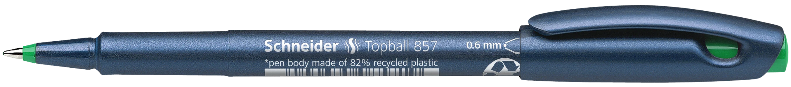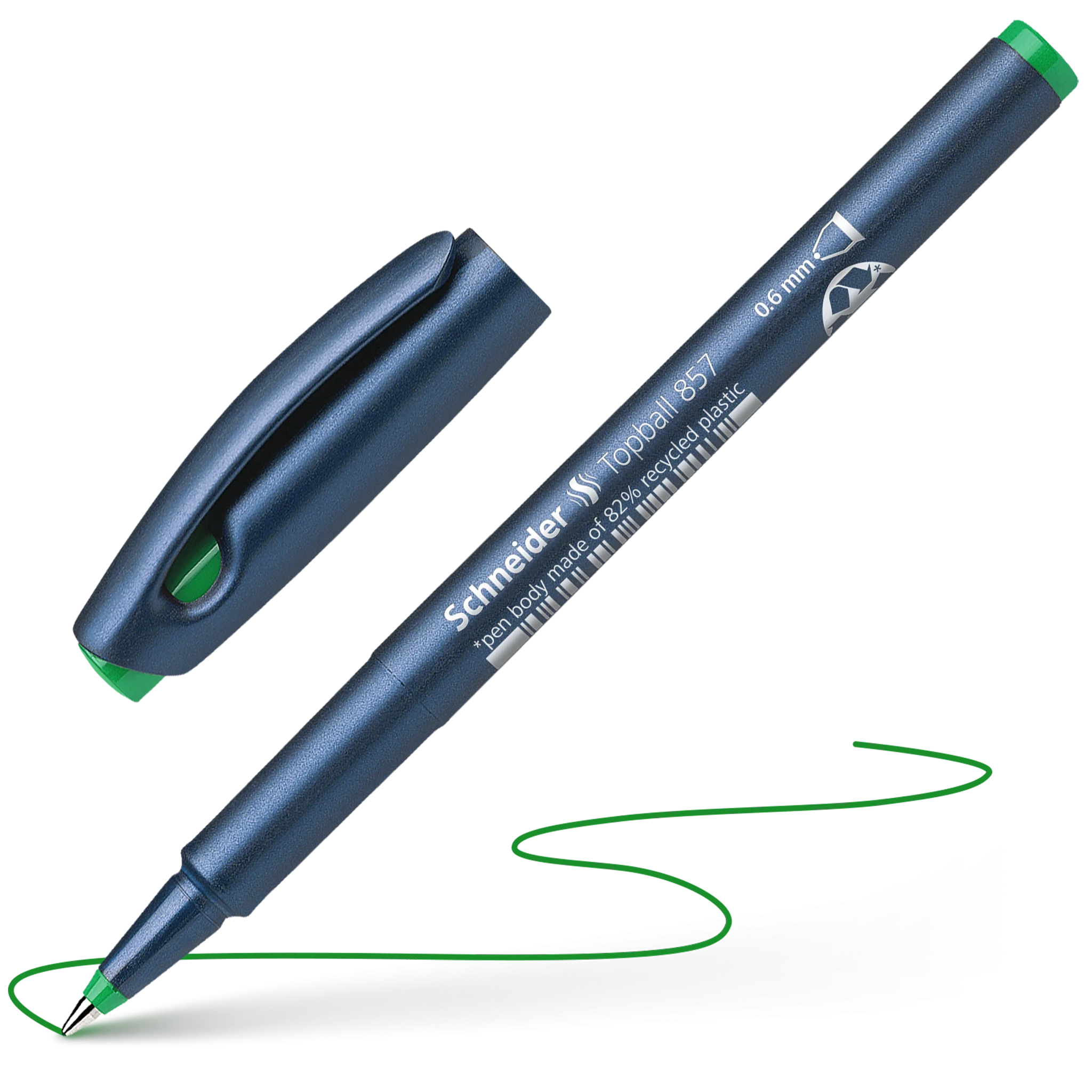 Rollerball with metal conical tip, line width approx. 0.6 mm. Writing colour green. Ideal for comfortable and striking writing. Eco-friendly and resource-saving *pen body made of 82% recycled plastic. The cap-off ink does not run dry even if the cap is removed for 2-3 days.