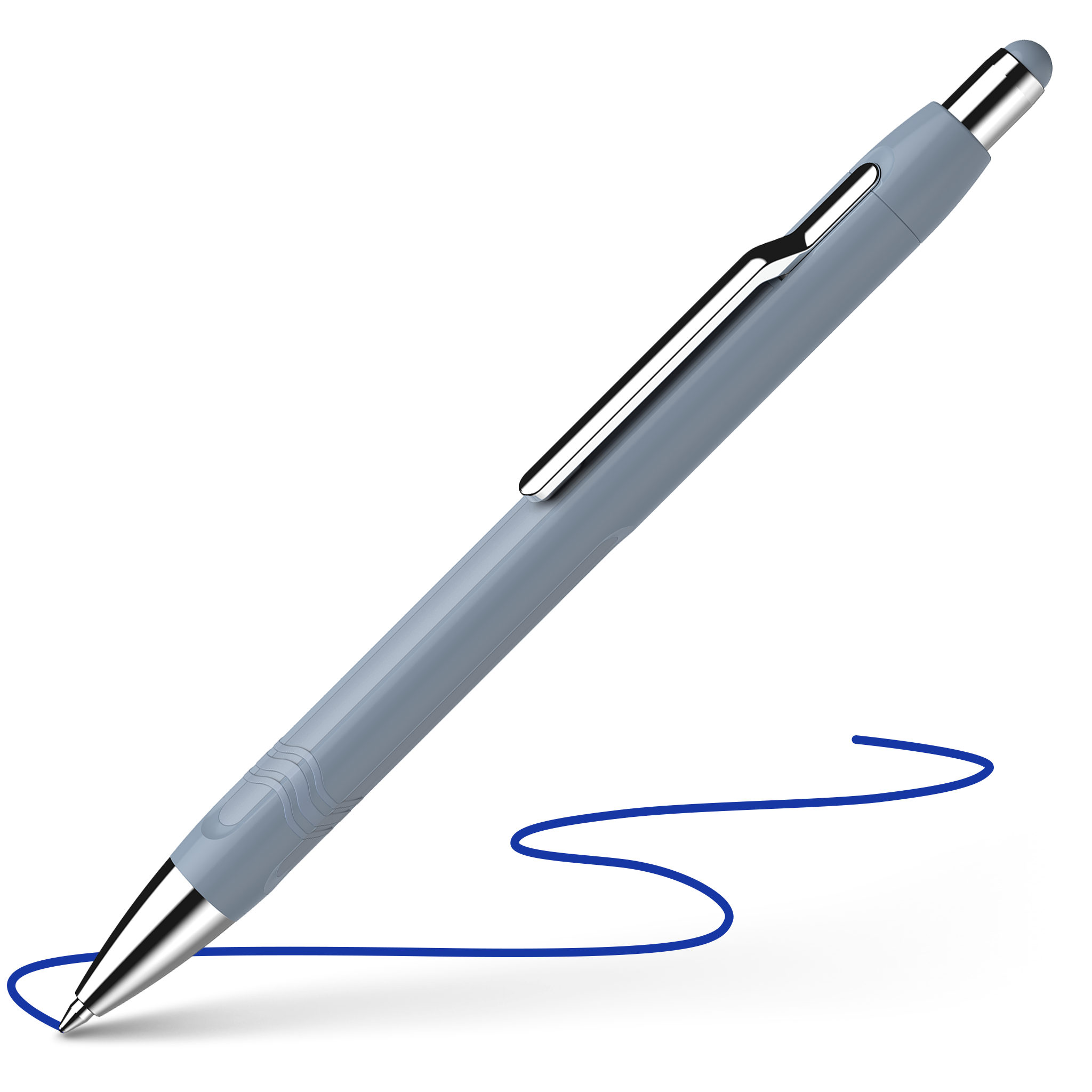 Ballpoint pen that combines classic design with modern elements. Particularly striking is the partially recessed metal clip and horizontal, colour-coordinated rubberized stripes that run along the barrel. It features three wavy lines in a soft material; they reflect the motif of the Schneider logo and prevent slipping. Replaceable giant refill Slider 755 extra broad (XB) with Viscoglide® technology for extraordinarily smooth and gliding writing. Barrel colour stone blue, writing colour blue, waterproof according to ink standard ISO 12757-2. The wear-resistant stainless steel tip guarantees that the large ink supply can be fully used and does not smear. The Epsilon has a spring-loaded metal clip and, thanks to the clever Plug+Play system, can use a variety of refill formats.