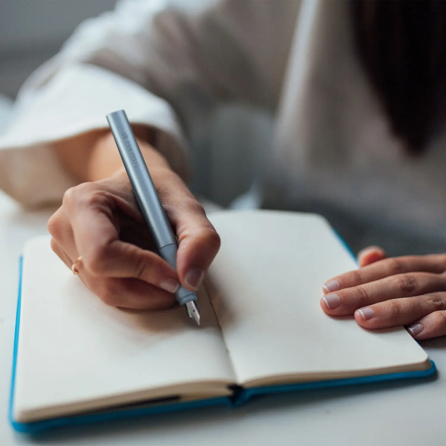 Fountain pen with ergonomically rubberised grip profile and high-quality stainless steel nib with iridium tip M. Modern design with elegant metallic look in colour \"blue\" and striking curves. Equipped with a sturdy metal clip and standard ink cartridge, royal blue, erasable. Spare front part available. Equally suitable for right and left-handers.