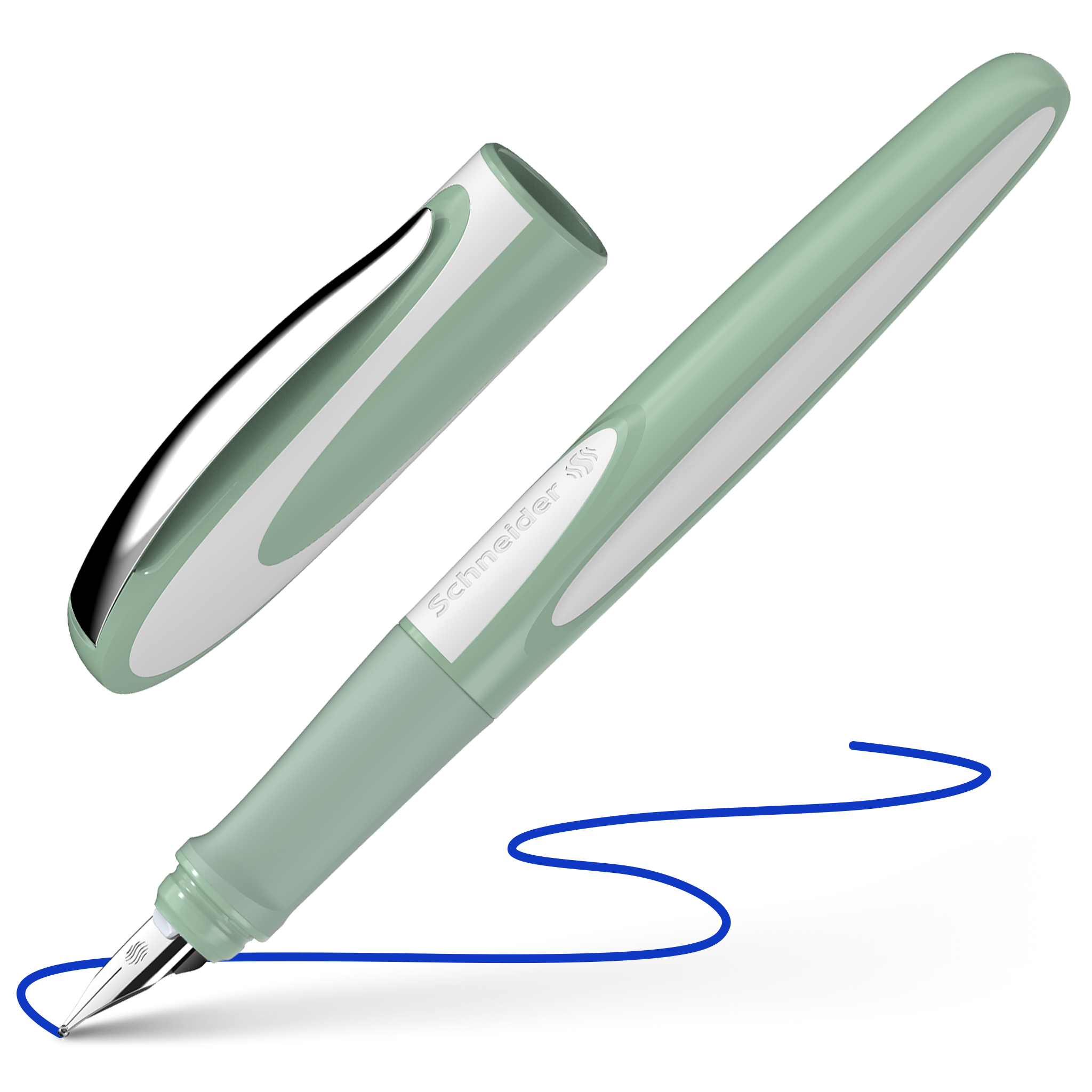 Fountain pen Ray with its futuristic design, which combines modernity, lifestyle and sportiness is conquering classrooms, offices and universities. The fountain pen for left-handers in colour \"pistacchio” with ergonomically rubberised grip profile is suitable for adults, children and school beginners. The high-quality stainless steel nib with iridium tip L provides exceptionally smooth, clean writing. The nib is very stable and can be replaced if necessary. The cap has a sturdy stainless steel clip. The fountain pen is suitable for standard ink cartridges and piston converters and incl. 1 standard ink cartridge royal blue erasable. There is a reverse version M+ for right-handed users.