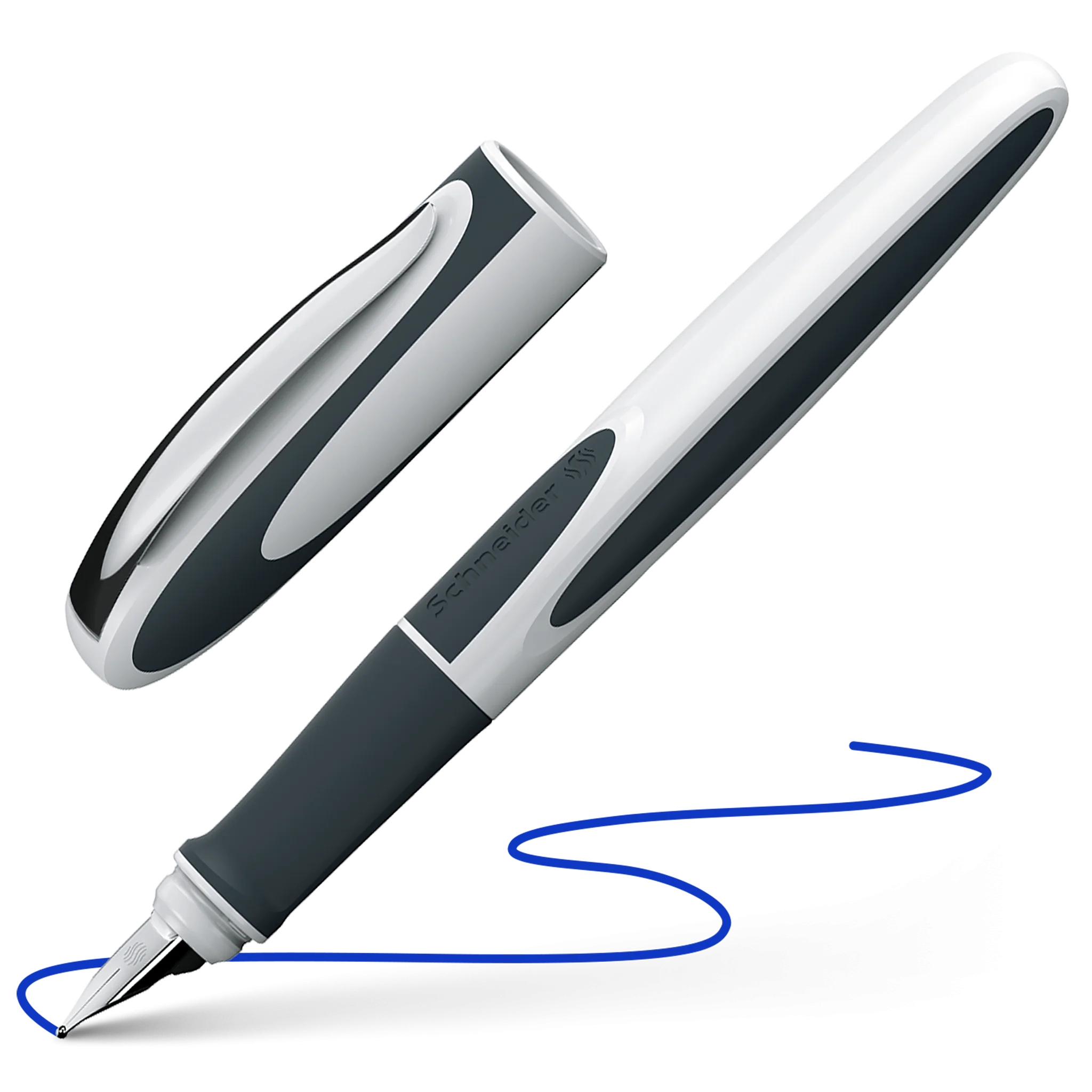 Fountain pen Ray with its futuristic design, which combines modernity, lifestyle and sportiness is conquering classrooms, offices and universities. The fountain pen for left-handers in colour \"white-dark grey” with ergonomically rubberised grip profile is suitable for adults, children and school beginners. The high-quality stainless steel nib with iridium tip L provides exceptionally smooth, clean writing. The nib is very stable and can be replaced if necessary. The cap has a sturdy stainless steel clip. The fountain pen is suitable for standard ink cartridges and piston converters and incl. 1 standard ink cartridge royal blue erasable. There is a reverse version M+ for right-handed users.