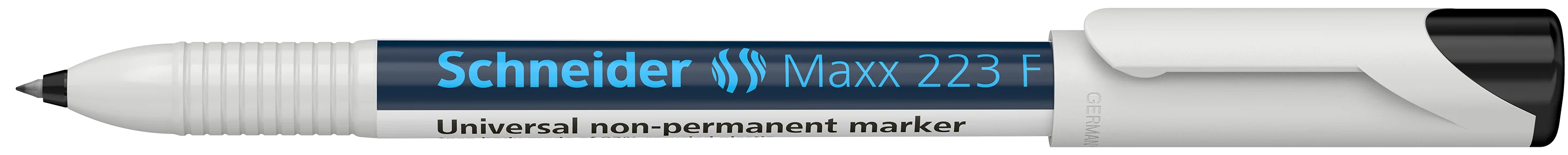 Non-permanent universal marker, fine line width (F) approx. 0.7 mm. Writing colour black. For writing on transparencies (OHP), paper, plastic, glass, metal and almost all other materials. This non-permanent marker is ideal for the office, in school or in the craft business. Whether on wall calendars, films or on sticky notes, the Schneider Maxx 223 does not shine through on paper, is color-vibrant, quick-drying and can still be wiped-off easily with a moist cloth. It has a low odour and is free of toluol and xylol. Slim pocket model with practical clip cap. Eco-friendly and resource-saving *pen body made of 92% recycled plastic.