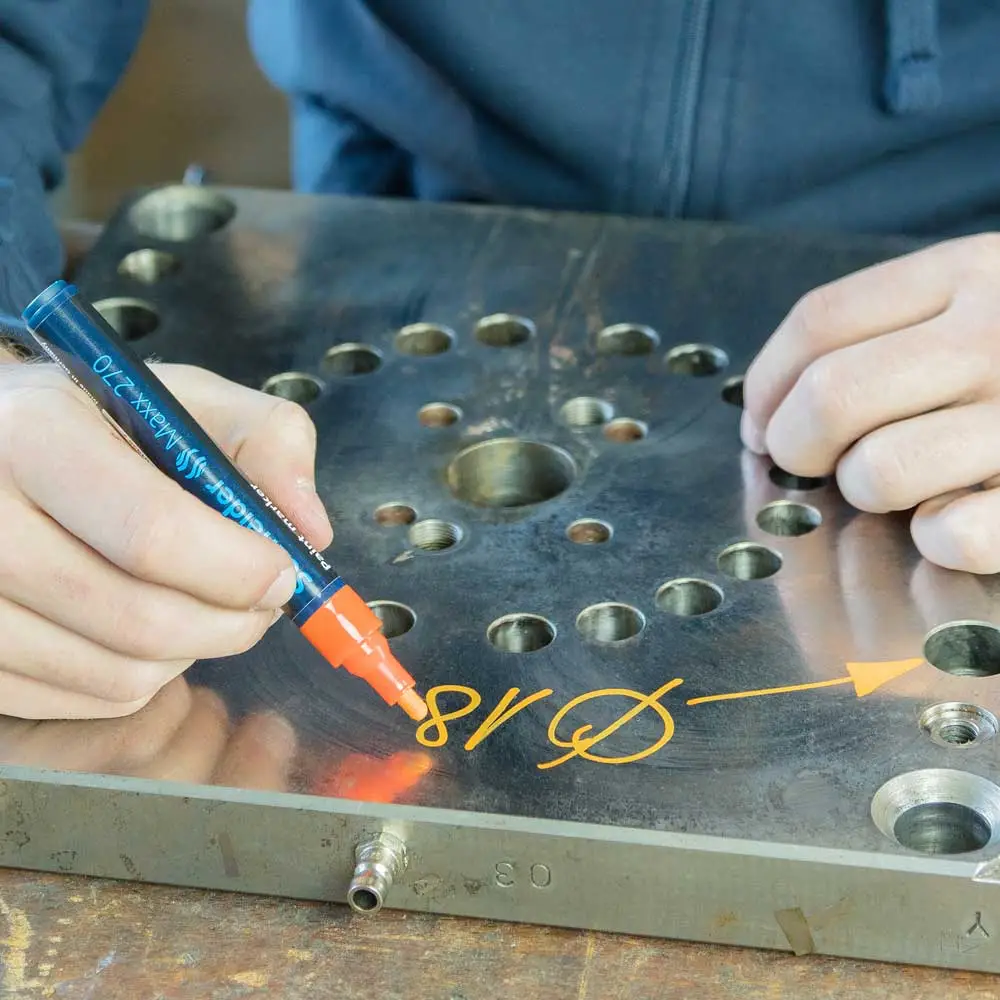Paint marker with bullet tip for a strong line width of 1-3 mm. Writing colour red. Ideal for marking and decorating rough and smooth surfaces, e.g. paper, plastic, glass, ceramics, metal, leather, rubber, etc. The marks made are highly opaque, have very good adhesion and abrasion resistance on almost all materials, are lightfast, water and weatherproof, resistant to many etching and washing procedures, as well as heat-resistant to up to 300 °C. The ink is controlled by a valve and is free of toluol and xylol. Replaceable writing tip.