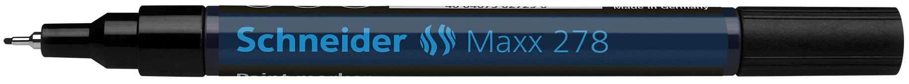 Paint marker with fine tip for a line width of approx. 0.8 mm. Writing colour black. Ideal for marking and decorating rough and smooth surfaces, e.g. paper, plastic, glass, ceramics, metal, leather, rubber, etc. The marks made are highly opaque, have very good adhesion and abrasion resistance on almost all materials, are lightfast, water and weatherproof, resistant to many etching and washing procedures, as well as heat-resistant to up to 300 °C. The ink is controlled by a valve and is free of toluol and xylol. Replaceable writing tip.