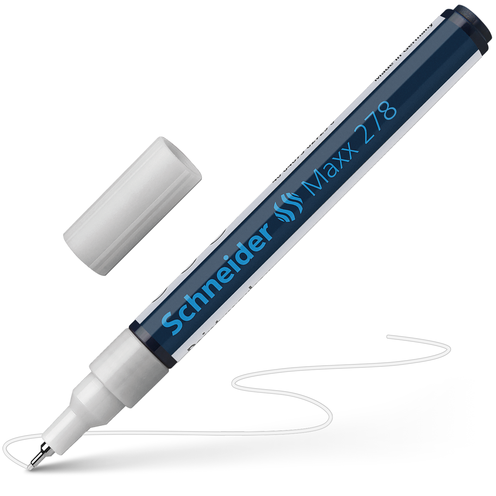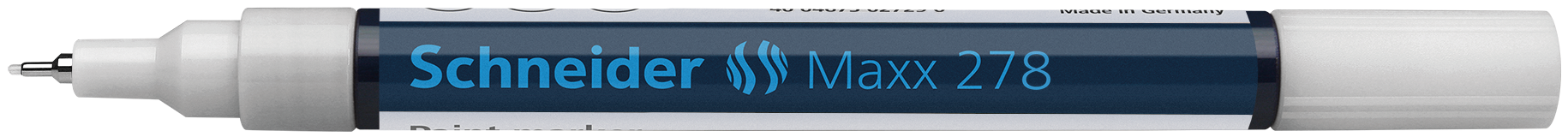 Paint marker with fine tip for a line width of approx. 0.8 mm. Writing colour white. Ideal for marking and decorating rough and smooth surfaces, e.g. paper, plastic, glass, ceramics, metal, leather, rubber, etc. The marks made are highly opaque, have very good adhesion and abrasion resistance on almost all materials, are lightfast, water and weatherproof, resistant to many etching and washing procedures, as well as heat-resistant to up to 300 °C. The ink is controlled by a valve and is free of toluol and xylol. Replaceable writing tip.