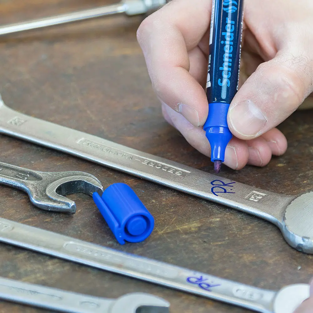 Permanent marker with aluminium barrel and bullet tip, line width 1-3 mm. Writing colour black. For writing on cardboard, paper, plastic, glass, metal, wood and almost all other materials. The writing is quick-drying, water-proof and highly light resistant. The cap-off ink does not run dry even if the cap is removed for 2-3 days. It has a low odour and is free of toluol and xylol. The marker has a practical clip cap and can be refilled using Maxx 650 refill bottle.